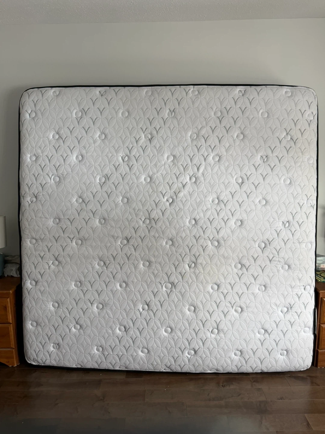 Selling a Sealy Posturepedic mattress. It is made in Canada and features a white quilted top with a black patterned border. The mattress is made of polyester fiber and polyurethane foam.