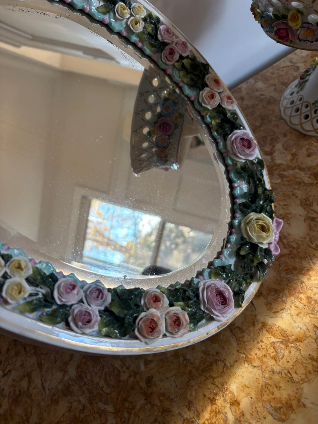 Selling a beautiful vintage porcelain mirror and bowl set. The mirror features cherub figurines and a delicate floral design around the edge. The bowl has a matching floral pattern and a unique lattice design. Both pieces are in great condition and would make a lovely addition to any home