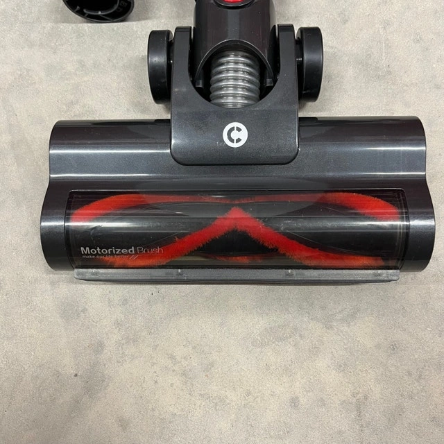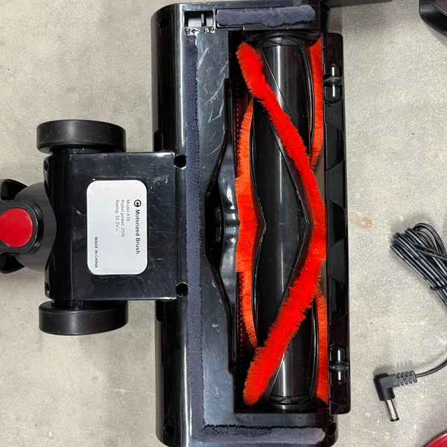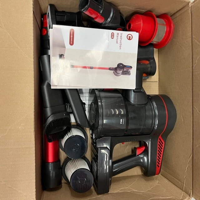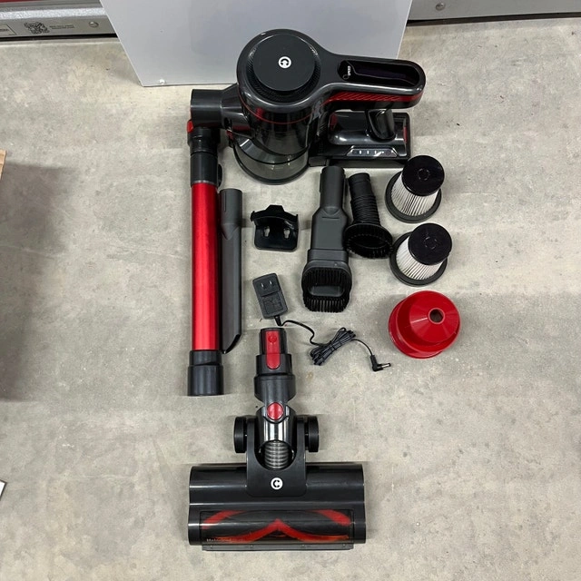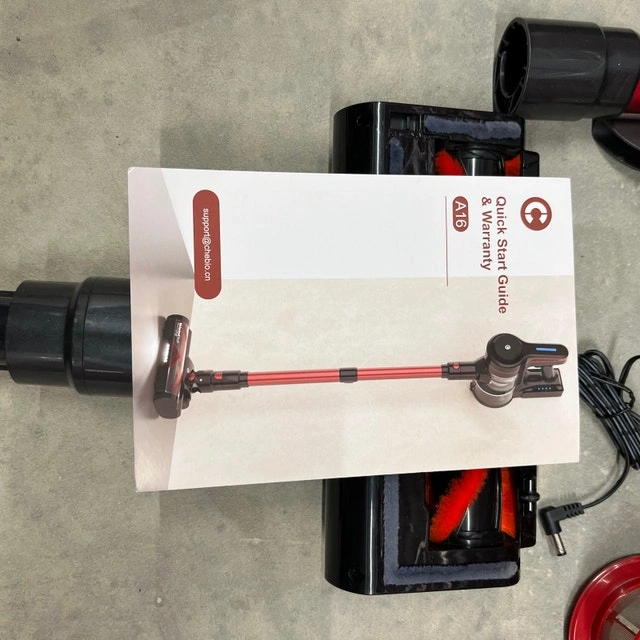 I'm selling a used red and black A16 Cordless Vacuum Cleaner that boasts strong suction for thorough cleaning across various surfaces. This lightweight and versatile vacuum is perfect for quick clean-ups around the house. Key features include: