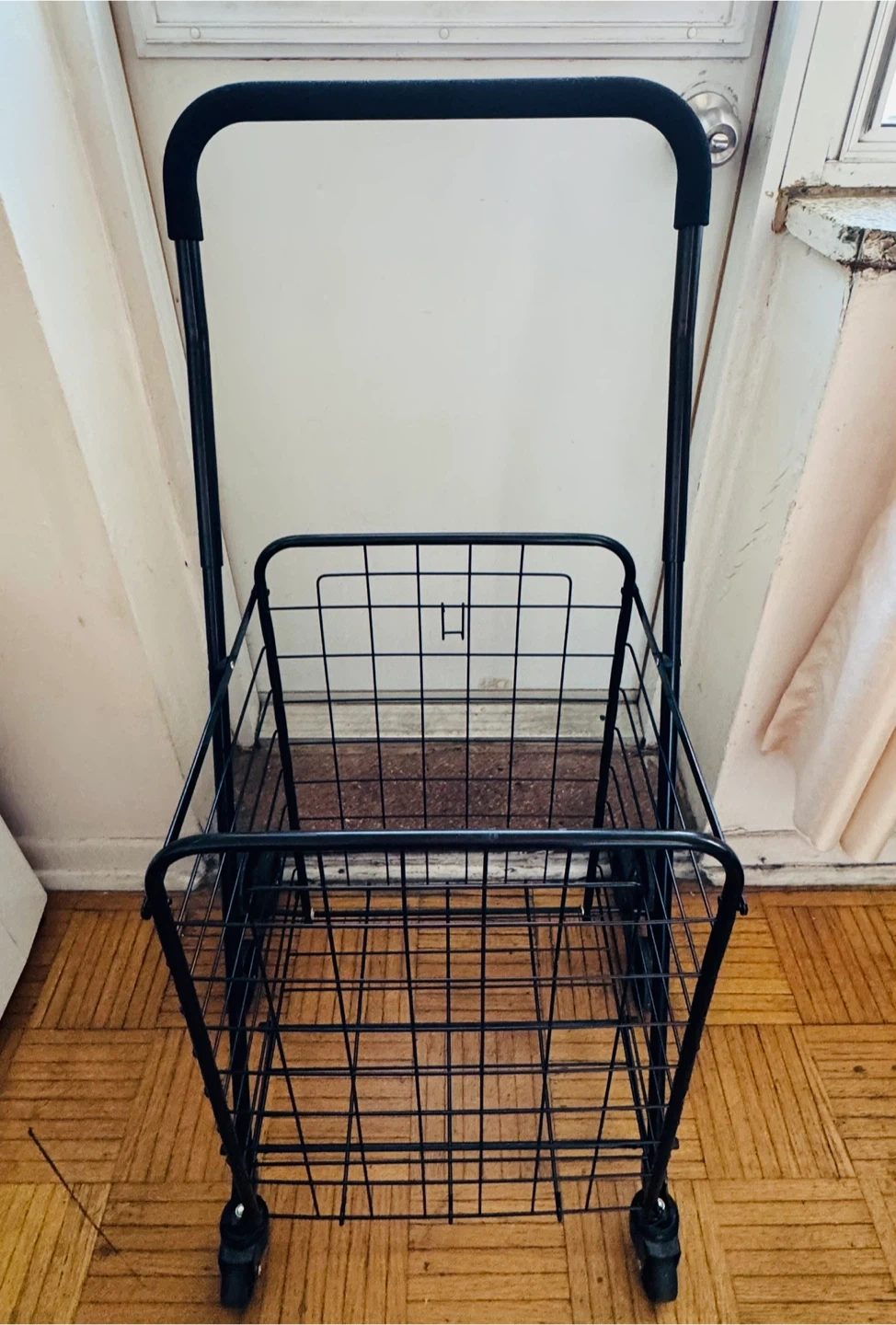 Selling a handy black metal rolling shopping cart! It's perfect for groceries, laundry, or anything else you need to haul around. It's in great shape and ready for a new home