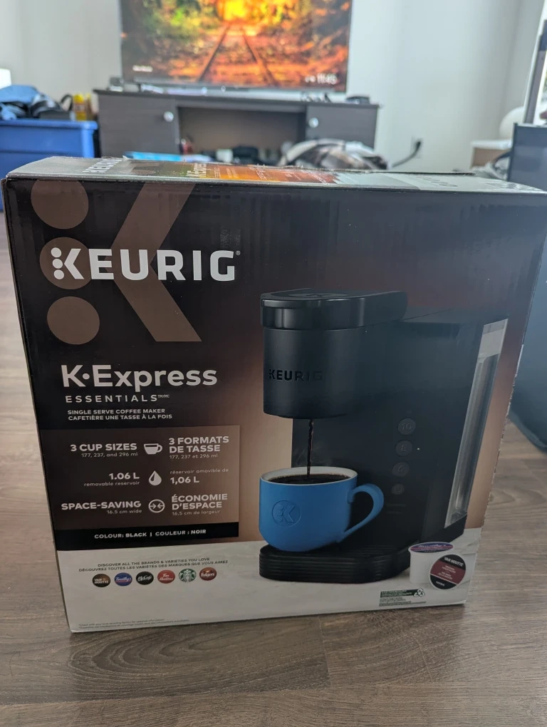 Selling a Keurig K-Express Essentials single serve coffee maker in black! It's brand new and still in its original box. This space-saving machine brews 3 cup sizes and has a 1.06L removable reservoir. Perfect for small kitchens or anyone who loves a quick and easy cup of coffee!