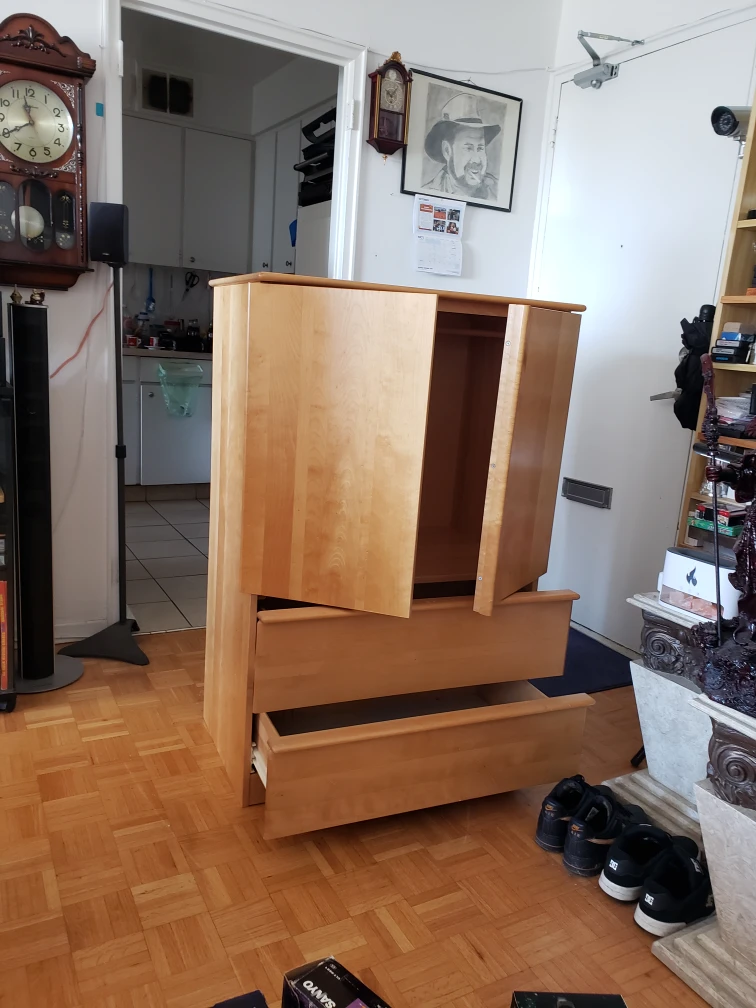 A wooden armoire with a set of drawers. It has a light wood finish and offers ample storage space. The armoire features sliding doors at the top and two large drawers at the bottom. It's in good condition and ready to use, it's solid wood free to a good home.
