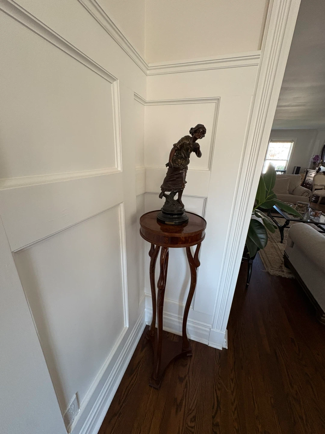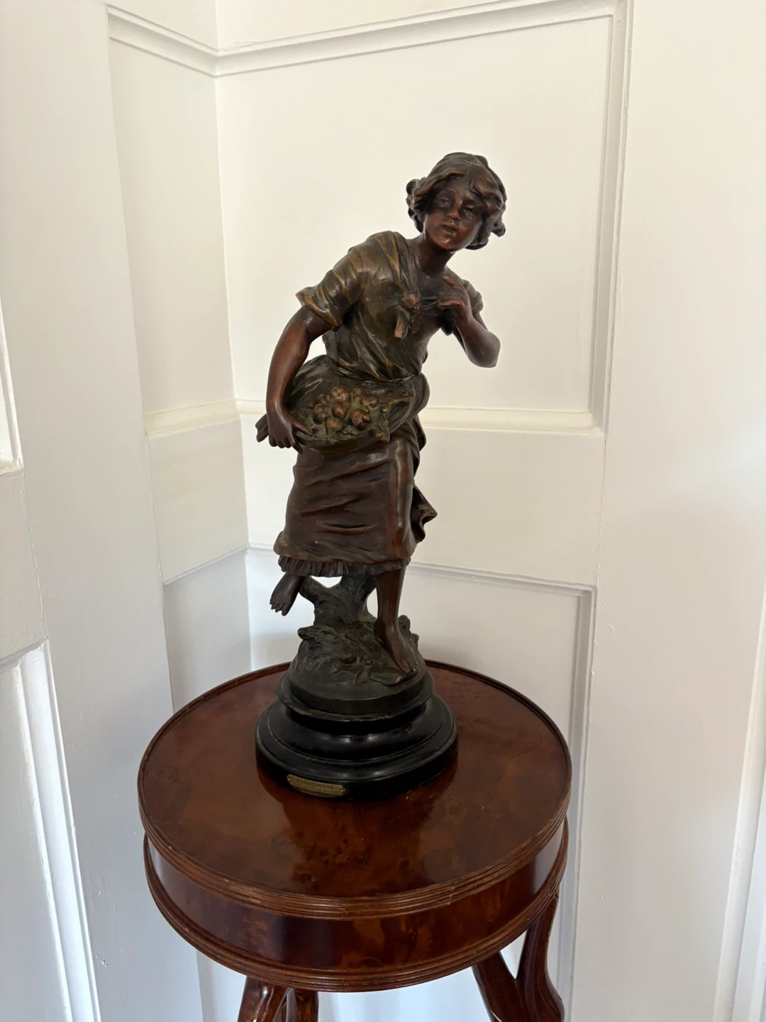 Selling a beautiful vintage bronze statue of a girl holding a basket of fruit. It's in great condition and would make a lovely addition to any home!