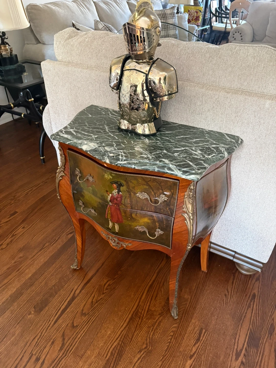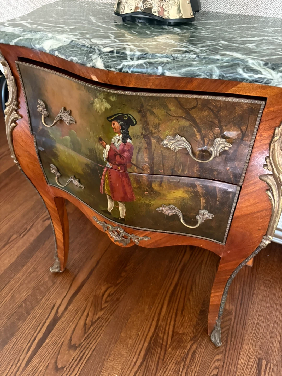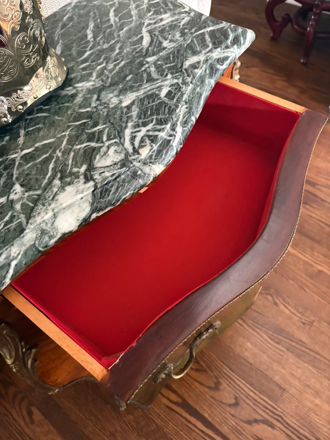 Beautiful vintage bombe chest featuring a marble top and unique painted drawers. It's a statement piece that adds character to any room. The interior of the drawers are lined with a lovely red velvet.