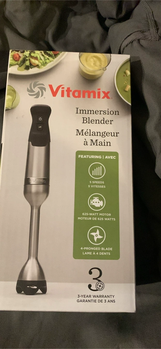 BRAND NEW UNUSED I'm selling a brand new Vitamix Immersion Blender in black! It features 5 speeds and a powerful 625-watt motor. The blender also has a 4-pronged blade and a protective bell guard. It comes with a 3-year warranty! The model number is VM0219.