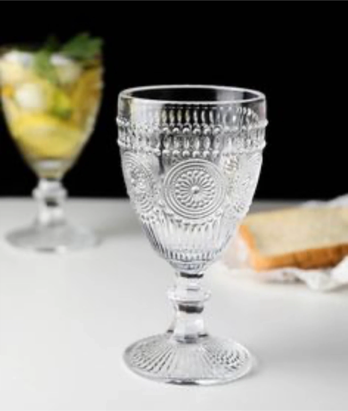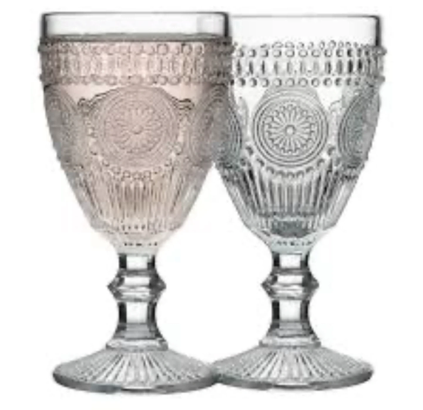 + 2 clear glass goblet with a vintage embossed sunflower pattern+ Starfrit LocknLock Easy Match 101 oz / 3 L Rectangular Container, Nestable and stackable+ Mainstays Stainless Steel Dutch Oven with Glass Lid, 5 qt