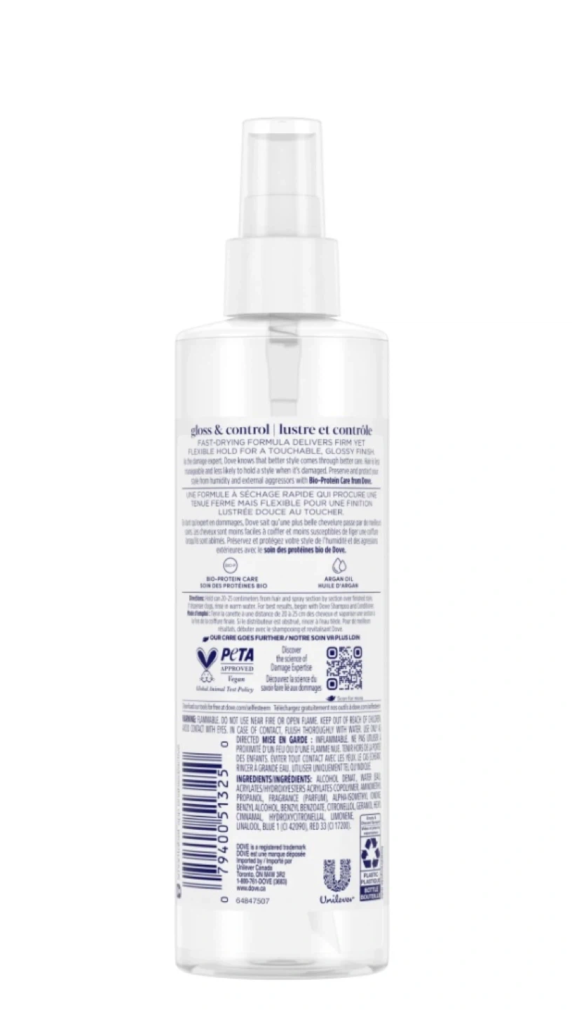 Selling a bottle of Dove gloss & control hair spray. It's a non-aerosol hairspray that provides extra strong hold. The bottle contains 273 mL of product and features bio-protein care for your hair