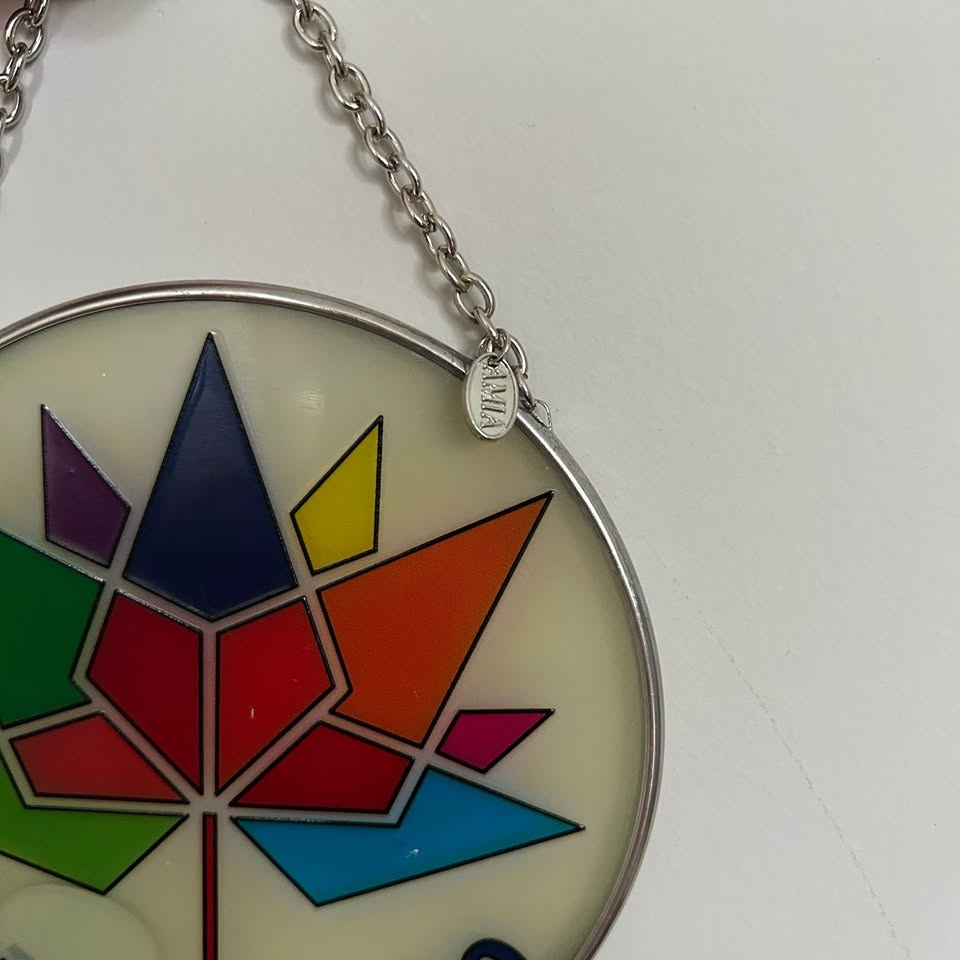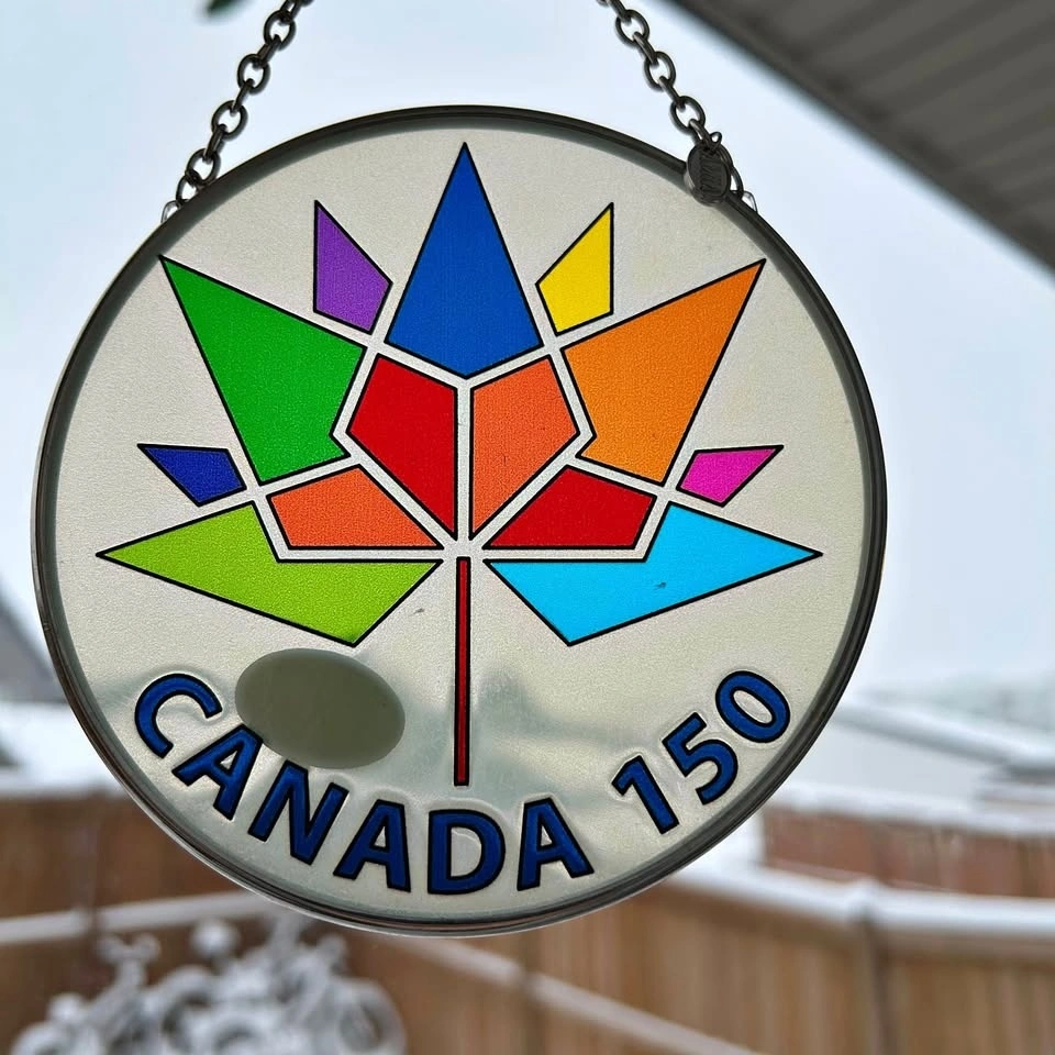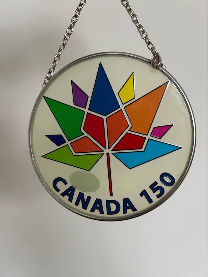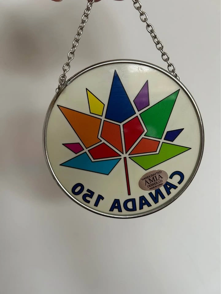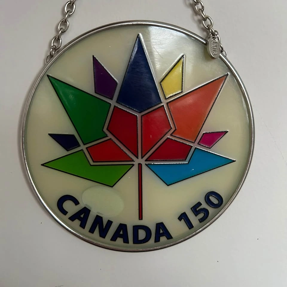 Beautiful Canada 150 collectible medallion with a vibrant stained-glass style maple leaf design. A commemorative piece created for Canada’s 150th anniversary, framed in metal and complete with a display chain. Great for collectors of Canadian memorabilia or as a unique decorative accent.
