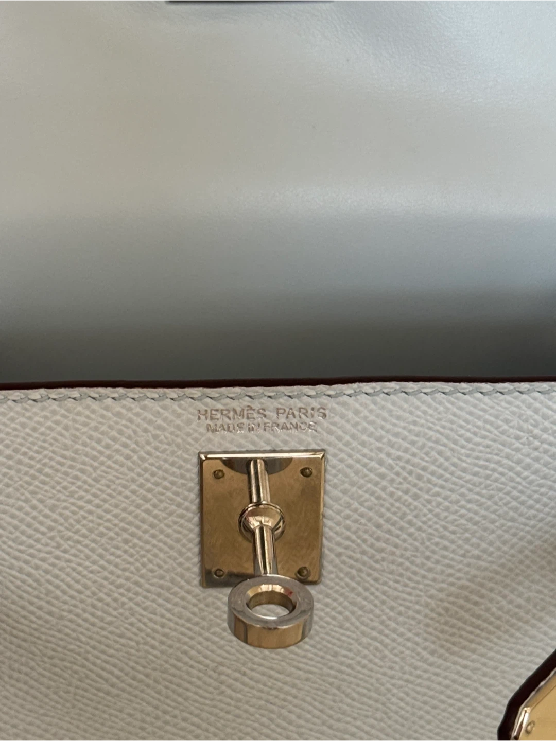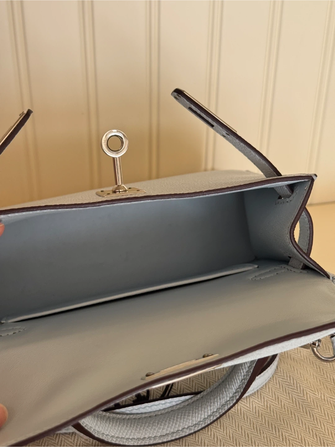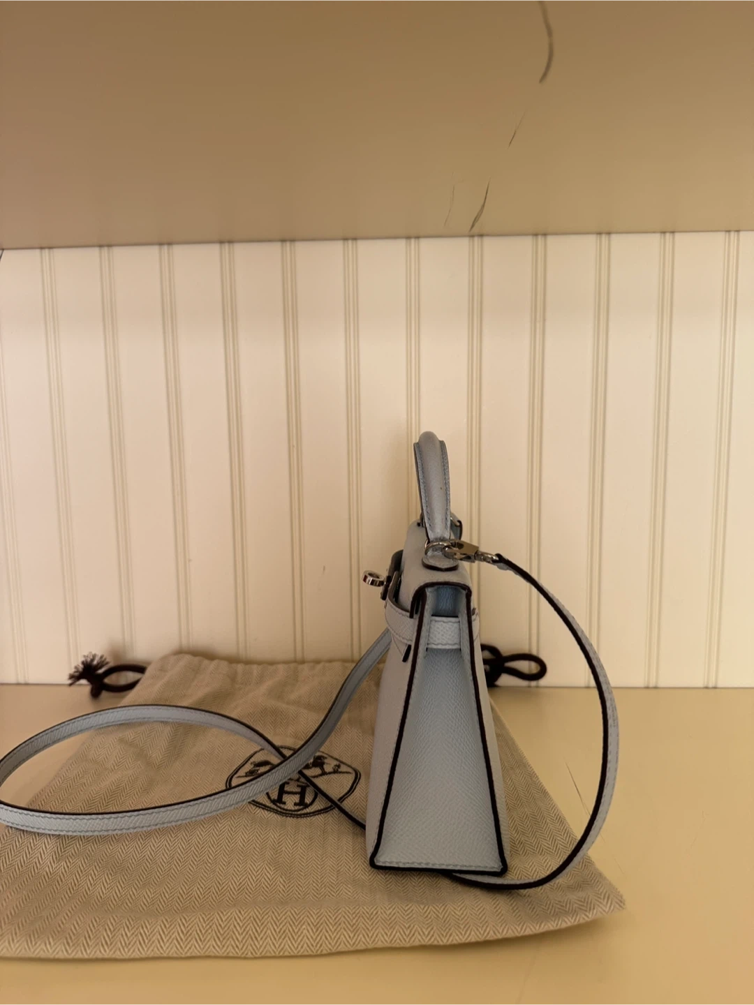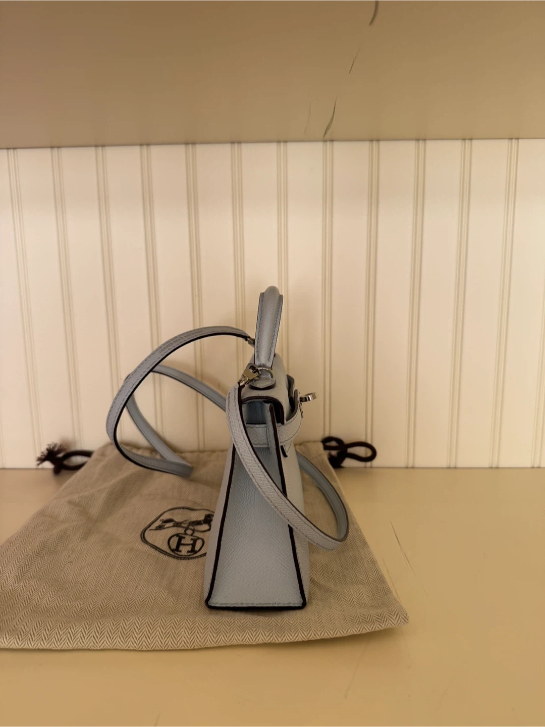 Selling a beautiful Hermès Mini Kelly 20 Sellier in Blue Brume. This iconic bag is in excellent condition and comes with its original dust bag. A timeless piece to add to your collection!