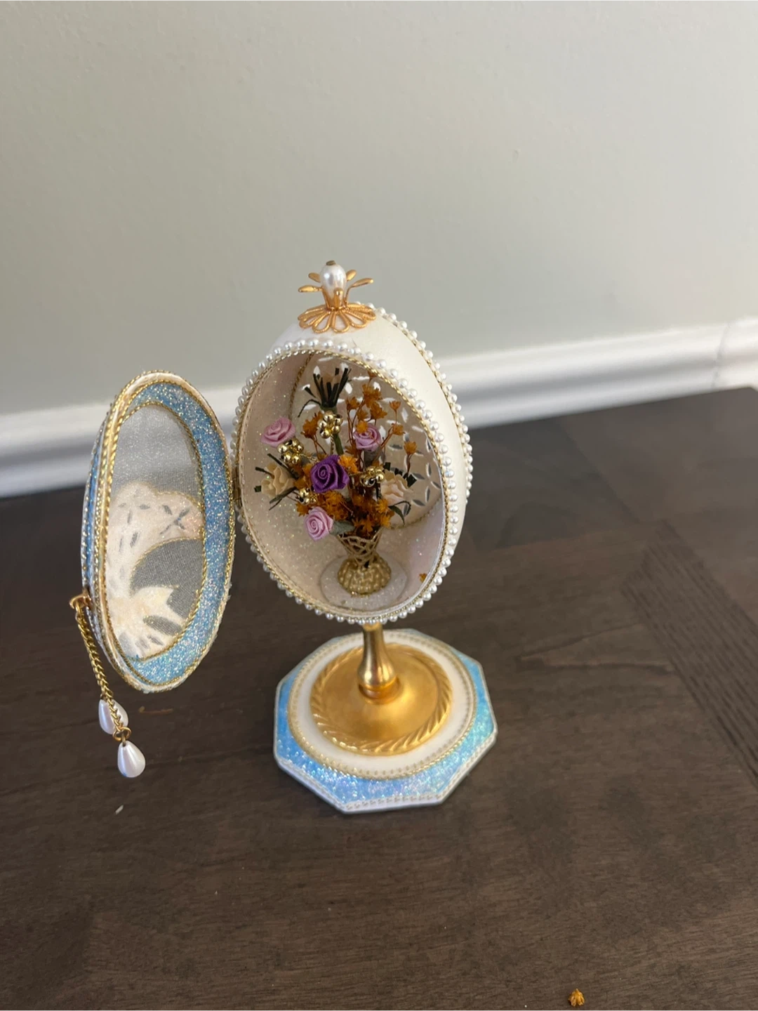 This is a beautiful decorative egg trinket box! It has a white exterior with blue and gold accents, adorned with pearls and opens to reveal a an arrangement of flowers inside. Perfect for adding a touch of elegance to any room!