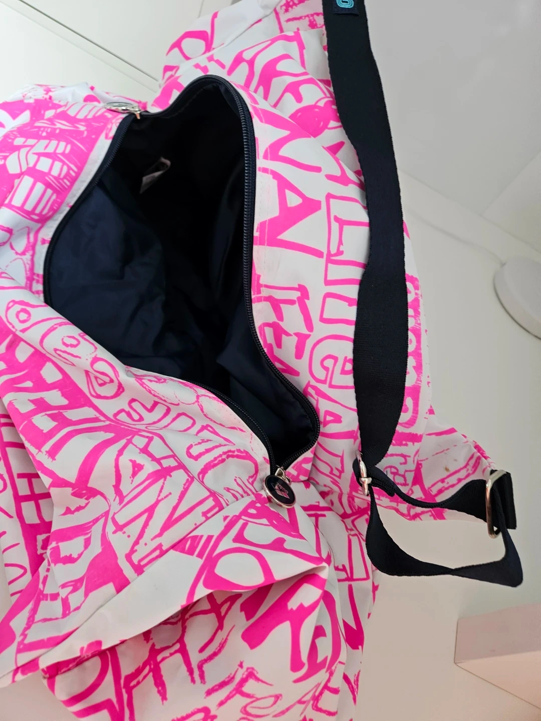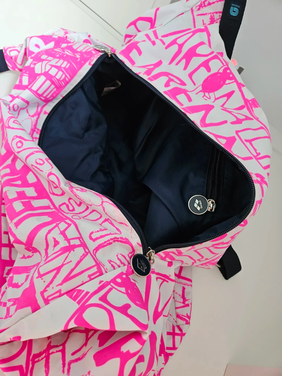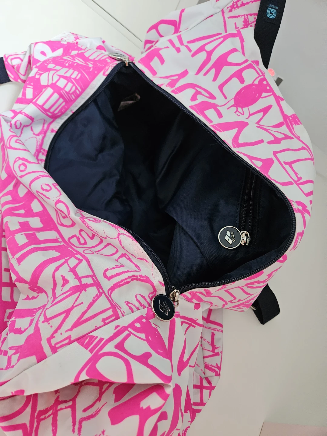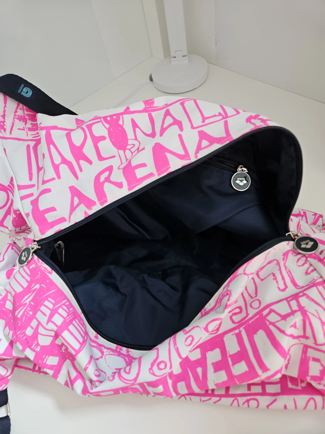 This Arena Spiky III duffle bag is perfect for the gym or travel! It features a fun pink and white design with the Arena logo. The interior is a dark navy colour and the bag has a zipper closure.