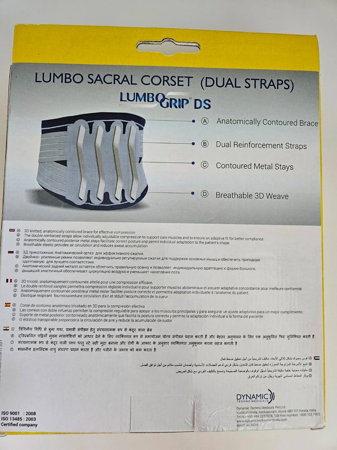Selling a Dynamic LumboGrip DS Lumbo Sacral Corset with dual straps in size M. This orthopaedic appliance features an anatomically contoured brace for effective compression and dual reinforcement straps. It's designed with breathable 3D weave for added comfort.