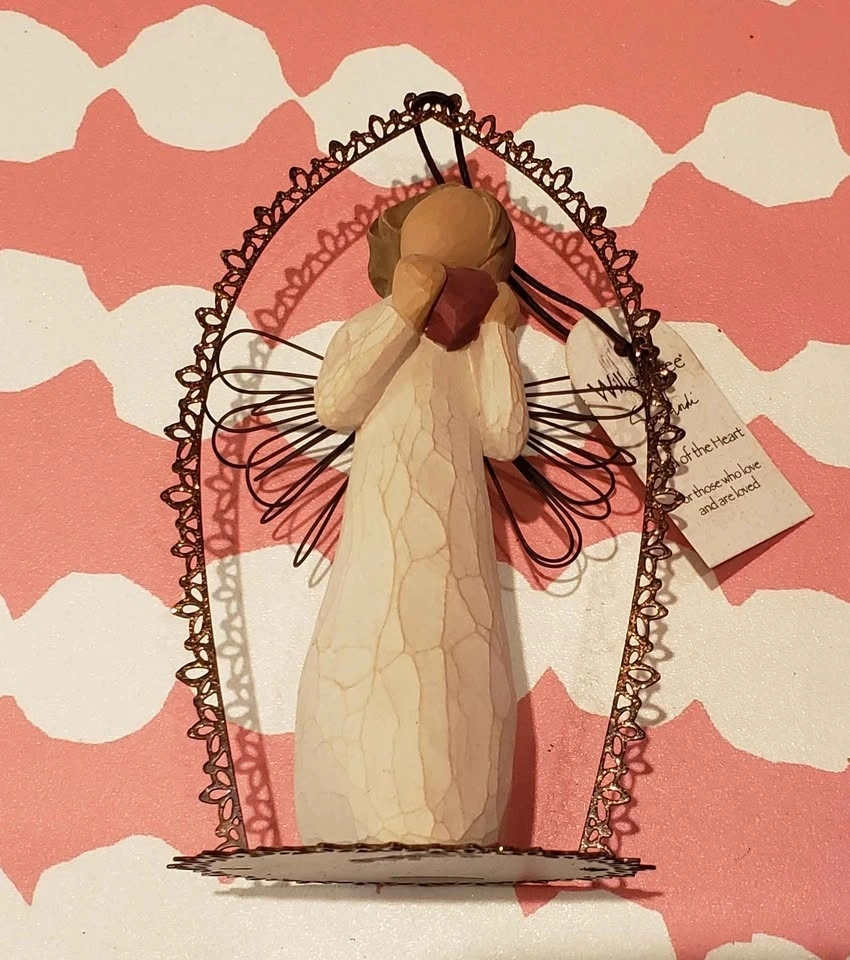 2010 Willow Tree Angel of the Heart ornament by Susan Lordi. Carved and painted wood in a metal frame with metal wings. Delicate design on the metal frame. Still has tag saying this angel is for those who love and are loved. Pick up in Upper Lonsdale North Vancouver.