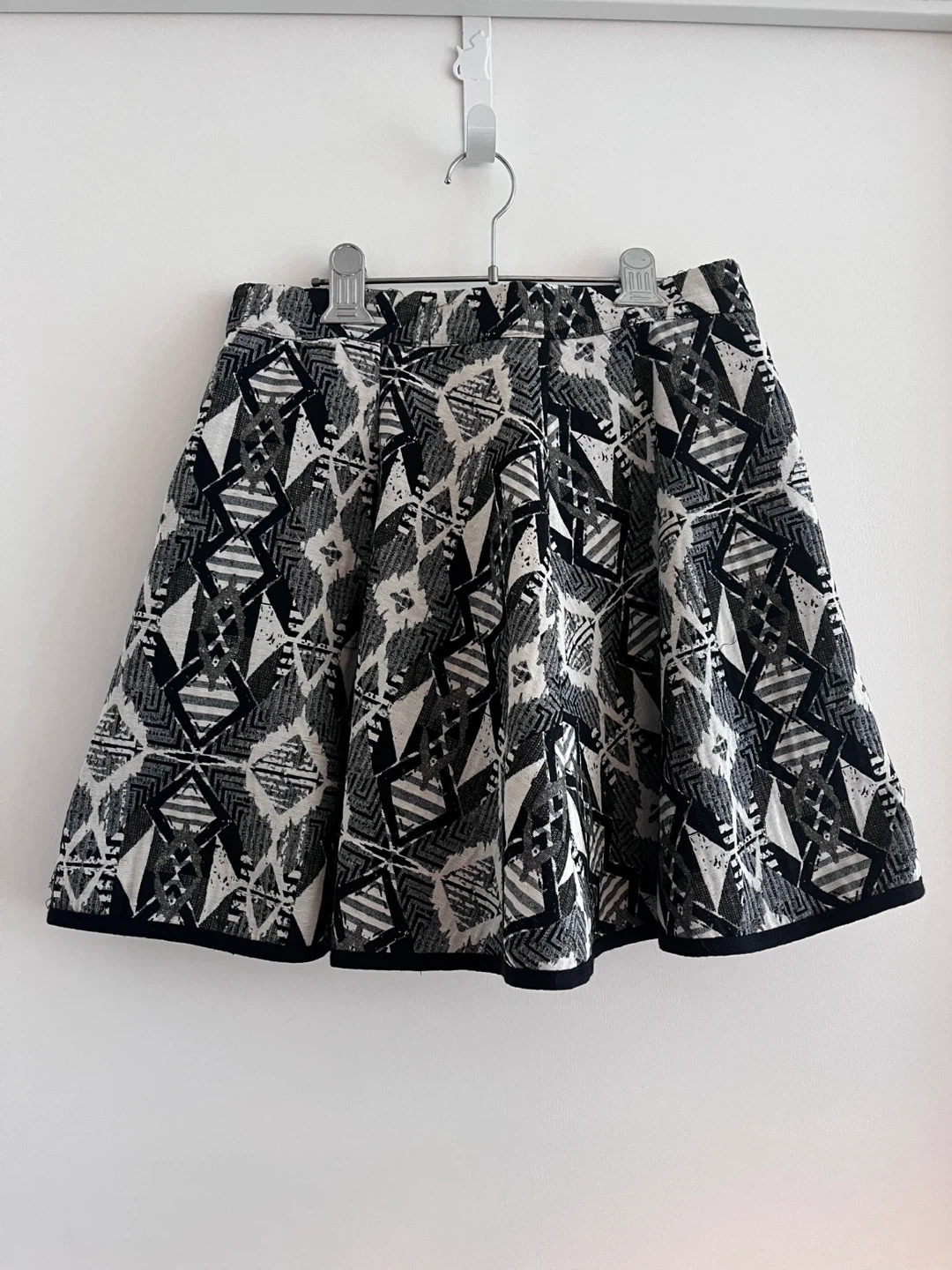 A stylish flared skater skirt with a black, grey, and white geometric pattern.