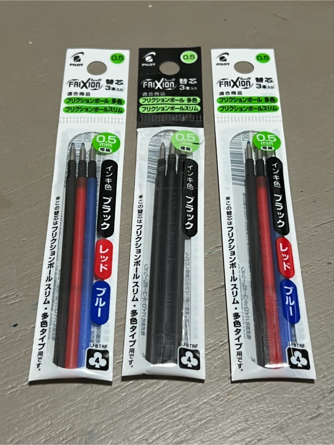I have some new Pilot FriXion 0.5mm refills for sale! These are great for anyone who loves the FriXion erasable pens. Each pack contains black, red, and blue ink refills. Perfect for your FriXion Ball Slim pens. Black one is opened but never used.