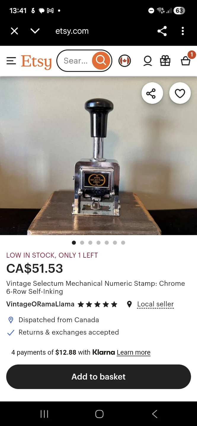 1 / 21 / 2Buy & SellVintage Selectum Mechanical Numeric StampVintage Selectum Mechanical Numeric Stamp$12.20Vintage Selectum mechanical numeric stamp. It's a chrome 6-row self-inking stamp. Great for adding a touch of retro charm to your projects. ConditionLike newWHERE TO MEETGerrard and JarvisView MapSELLERverifiedEmmaLeslieville94079 reviews0 chats·3 favorites·163 viewsSEND CHAT TO SELLERHi Emma! I’m interested in your listing.Hi Emma! I’m interested in your listing.Get the Karrot app to chatSign In to chat