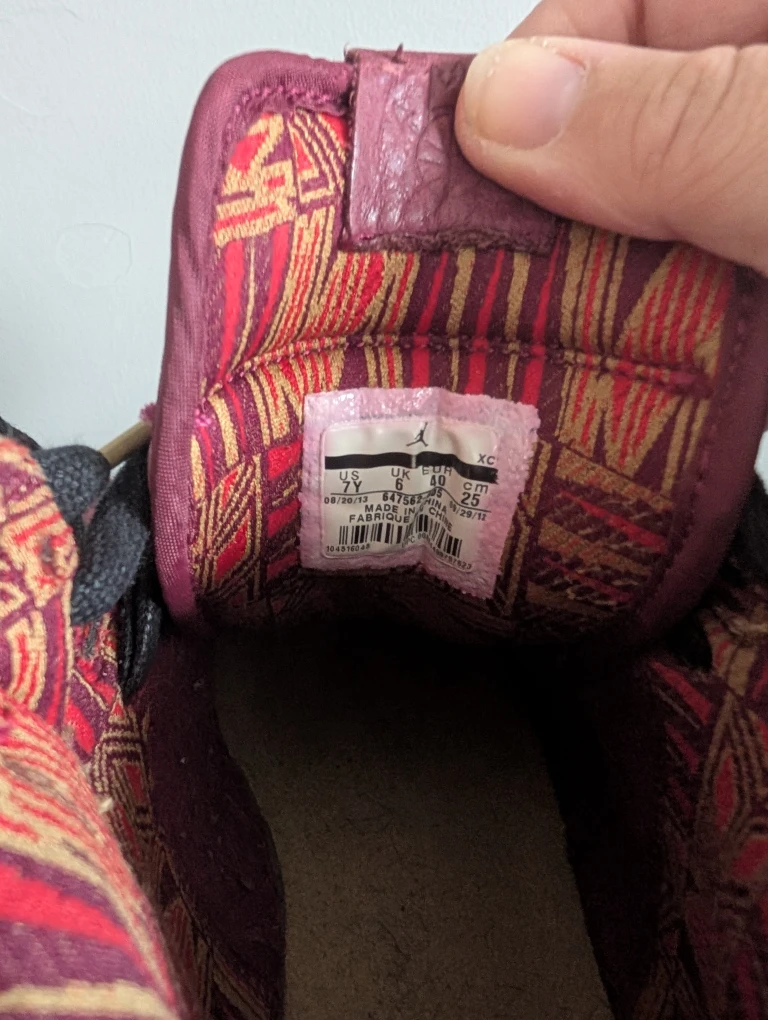 Selling a pair of Air Jordan 1 Mid BHM (Black History Month). These have a unique design with a mix of burgundy and bronze colours, and a patterned lining. They show some signs of wear but are still in good condition for casual wear!