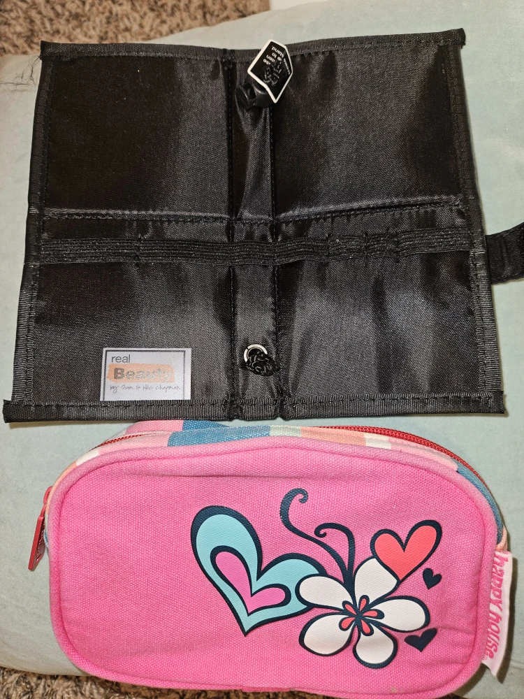 Cute pink cosmetic bag from Happy House! It's in great condition and ready for a new home. Perfect for storing your makeup or other small items. Includes a black travel brush case.