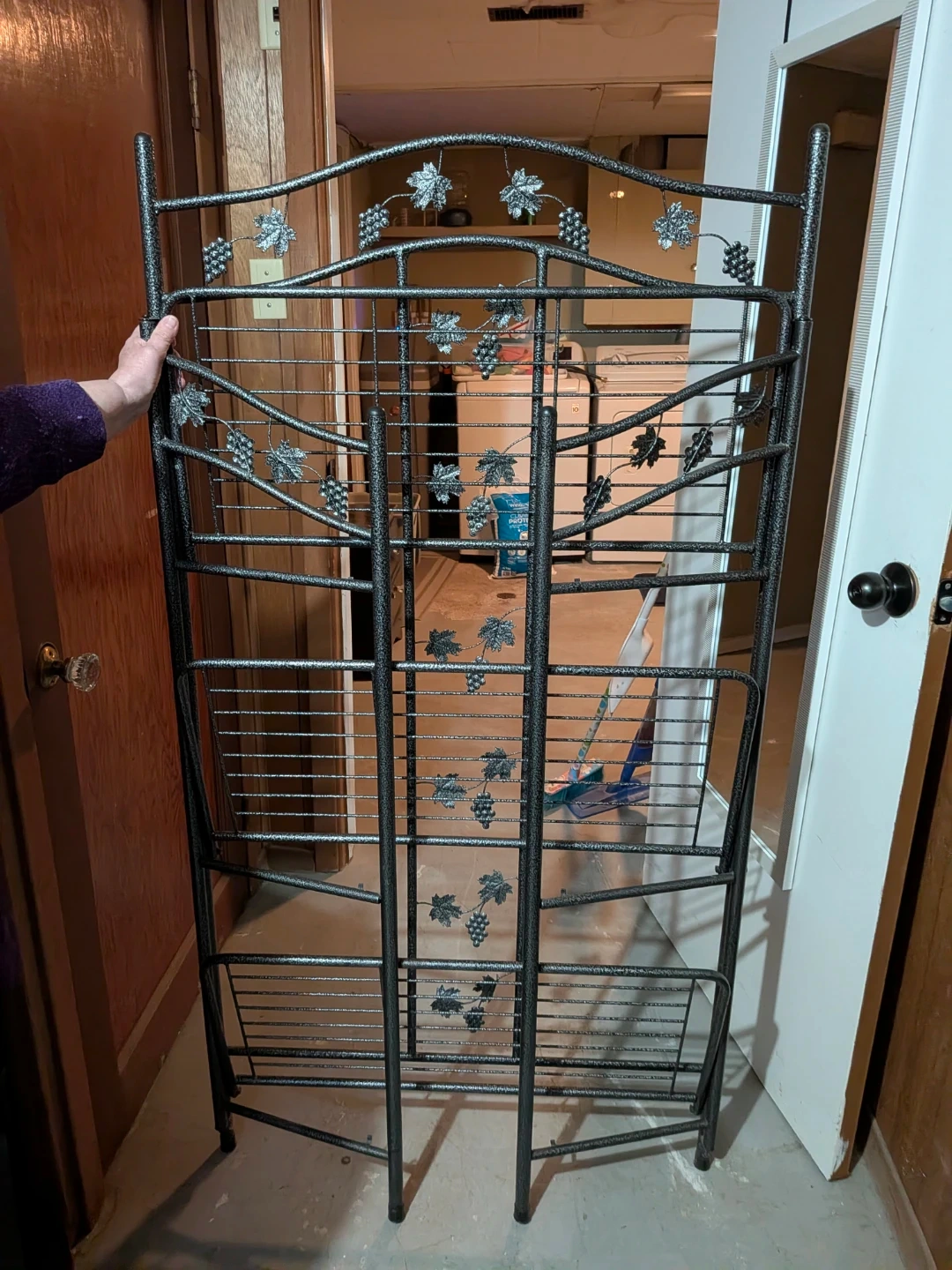 Selling a metal baker's rack with a grapevine design. It has three shelves, perfect for extra storage in your kitchen or dining room. It's in good condition and ready for a new home