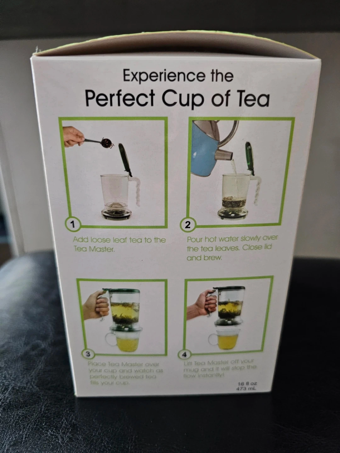Selling a Teapopia Tea Master with a stainless steel filter! It's perfect for brewing loose leaf tea. The box shows the steps for how to use it, making it super easy to get the perfect cup of tea. It holds 16 fl oz or 473 ml