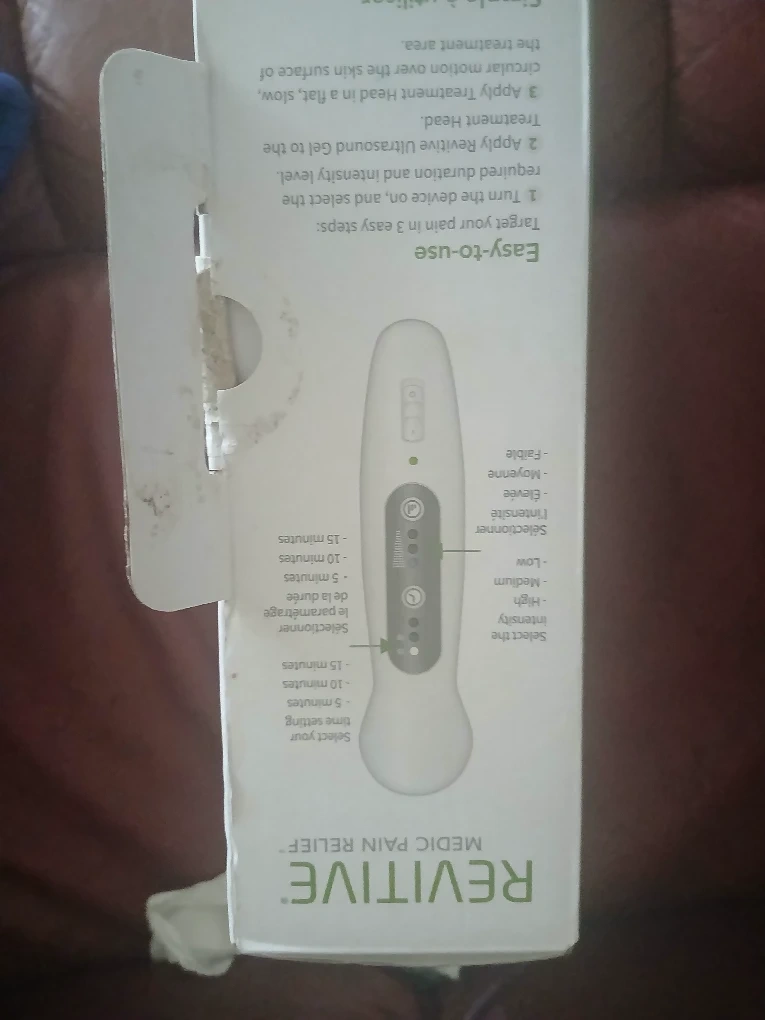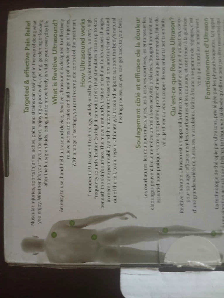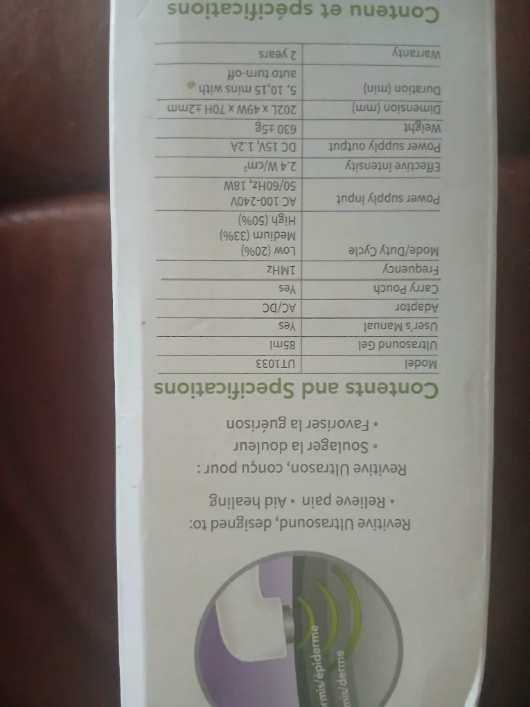 Selling a Revitive Ultrasound Therapy device for medic pain relief. It comes with the ultrasound gel, adaptor, and user manual. The device is designed to relieve pain and speed up healing. It also includes a carry pouch. Dimensions are 2021 x 49W x 70H 2.2mm and weighs 630 ±5g