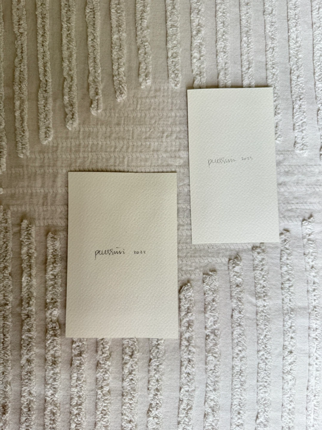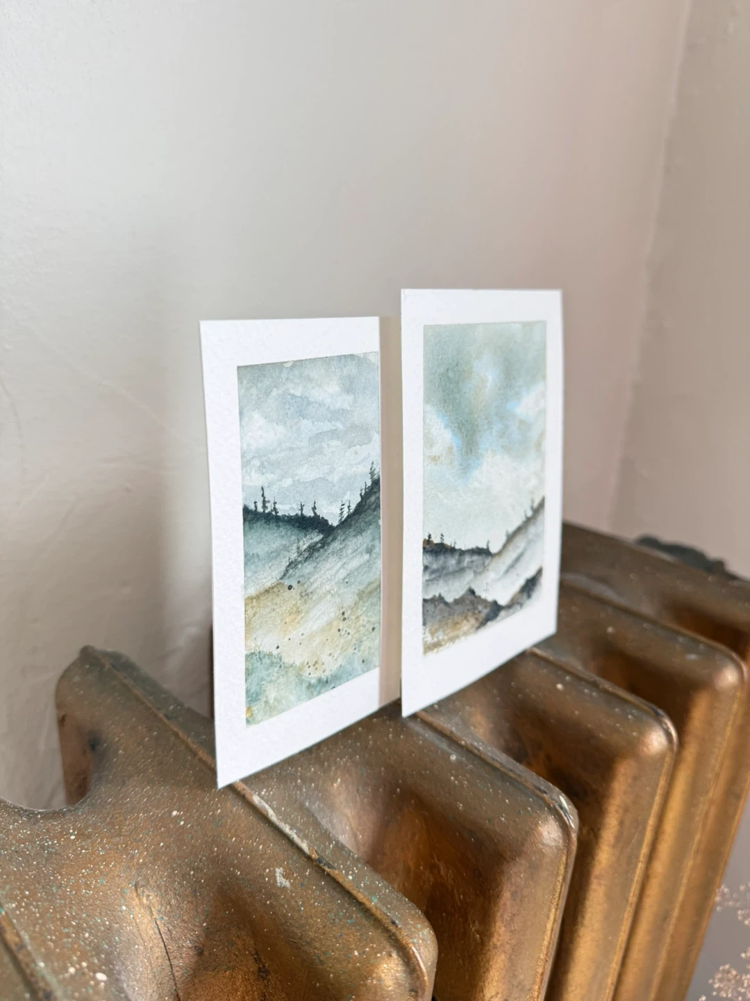 Two original Christina Peressini (Vancouver artist) watercolour paintings. Tiny landscapes in rich deep blues, greens, and greys of forests and mountains with cloudy skies.