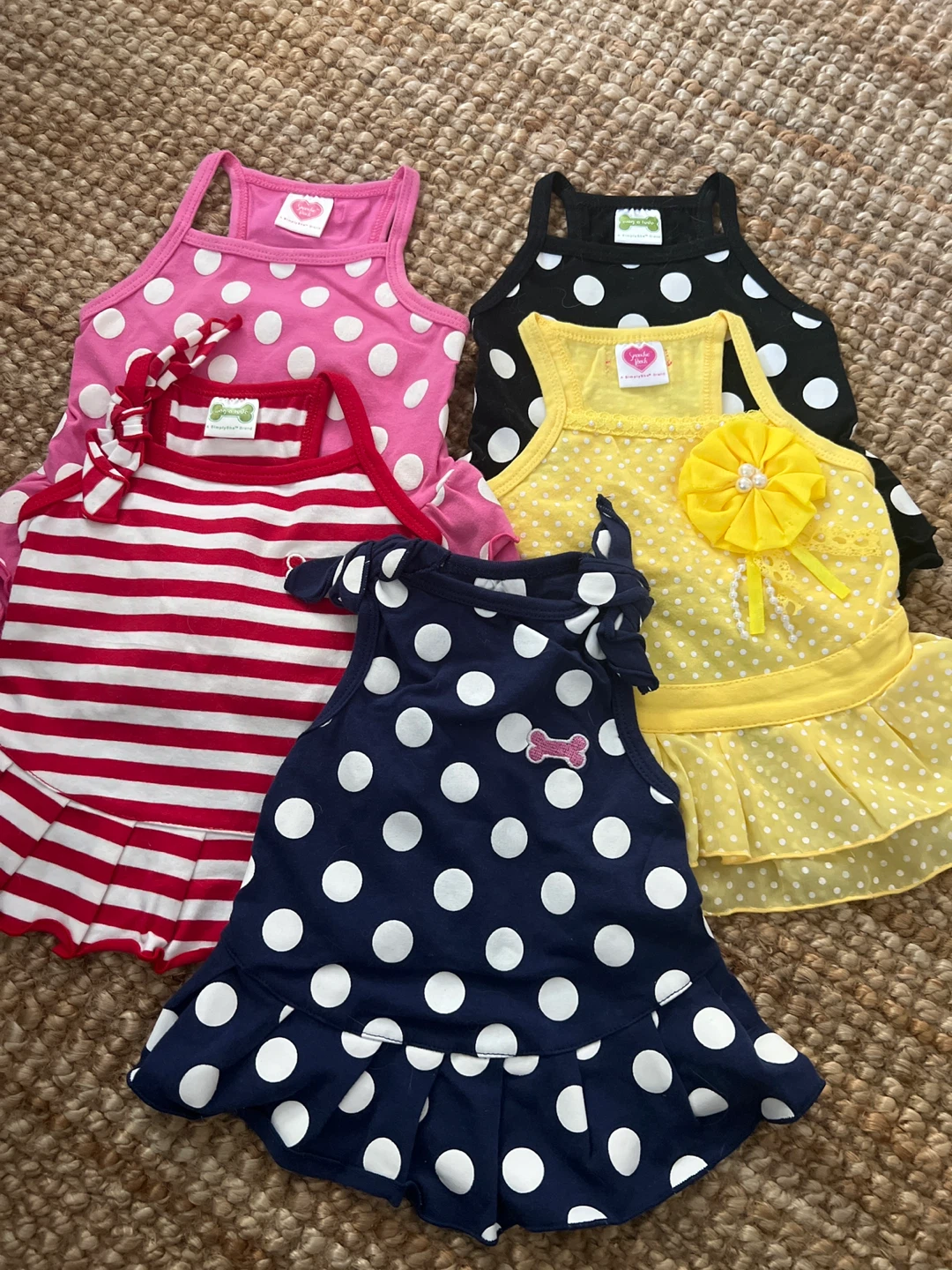 Cute bundle of dog dresses! There are five dresses in total, each with different colors and patterns. They all appear to be in good condition and ready for your furry friend to wear. Perfect for dressing up your pup! Size small