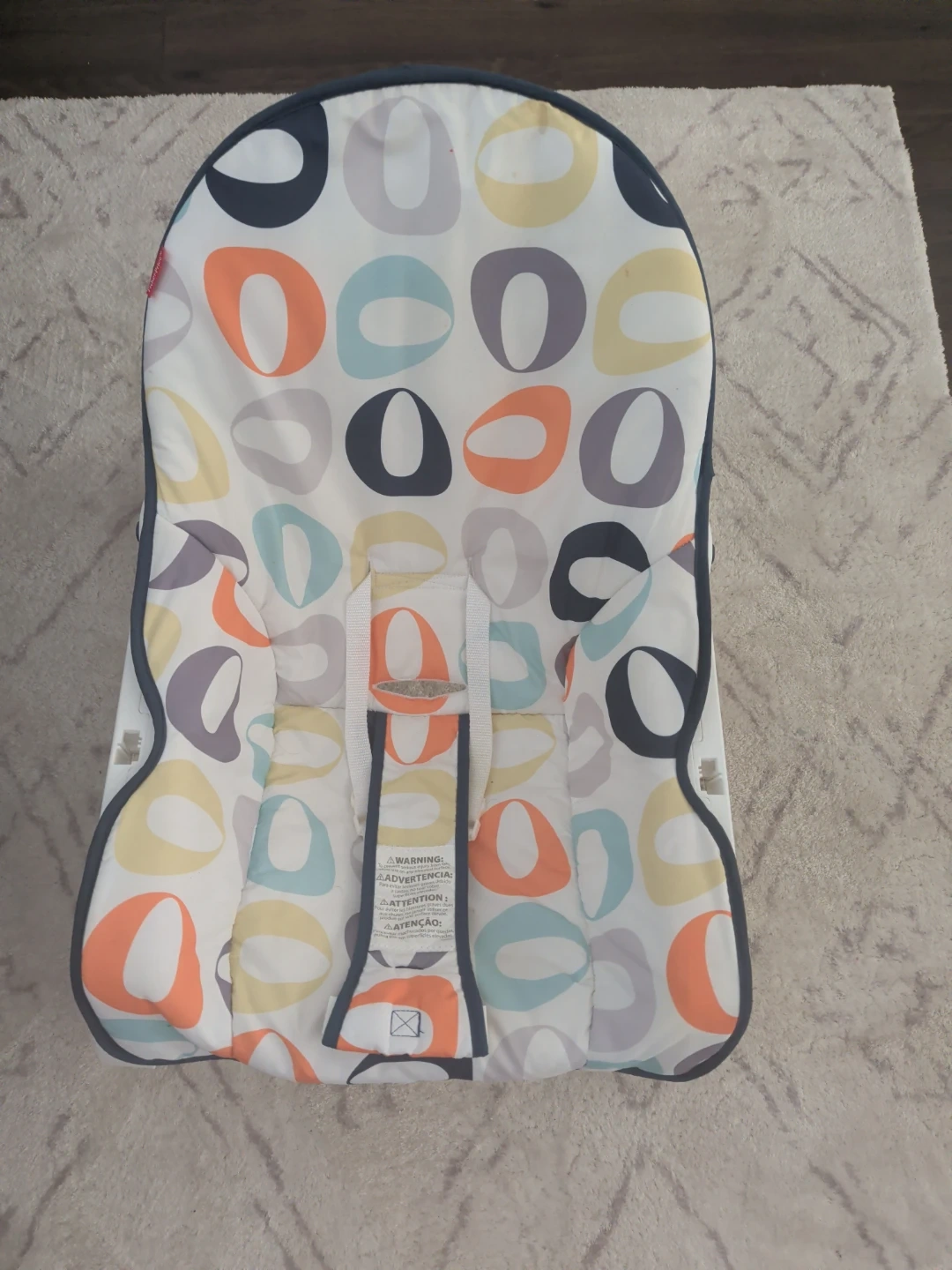Fisher-Price baby rocker with a fun, colourful pattern. It's got a secure harness and a comfortable seat for little ones. The gentle rocking motion can help soothe babies.