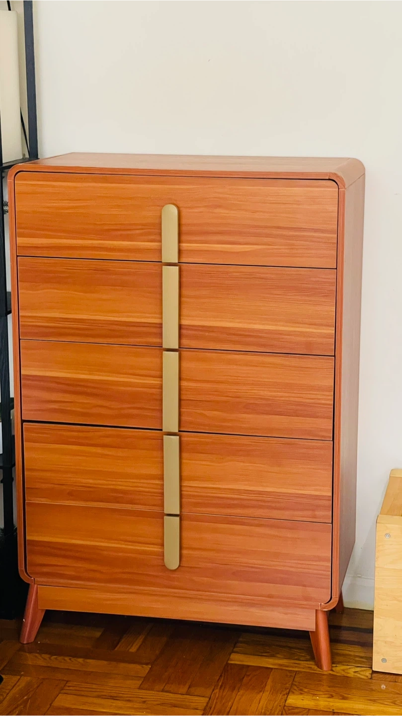I'm selling a wooden dresser with four drawers. It has a unique, modern design with a vertical handle. Everything works fine exept the two drawers down needs some handy man and ready for a new home!