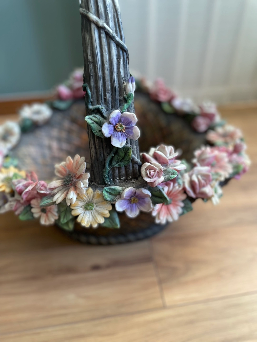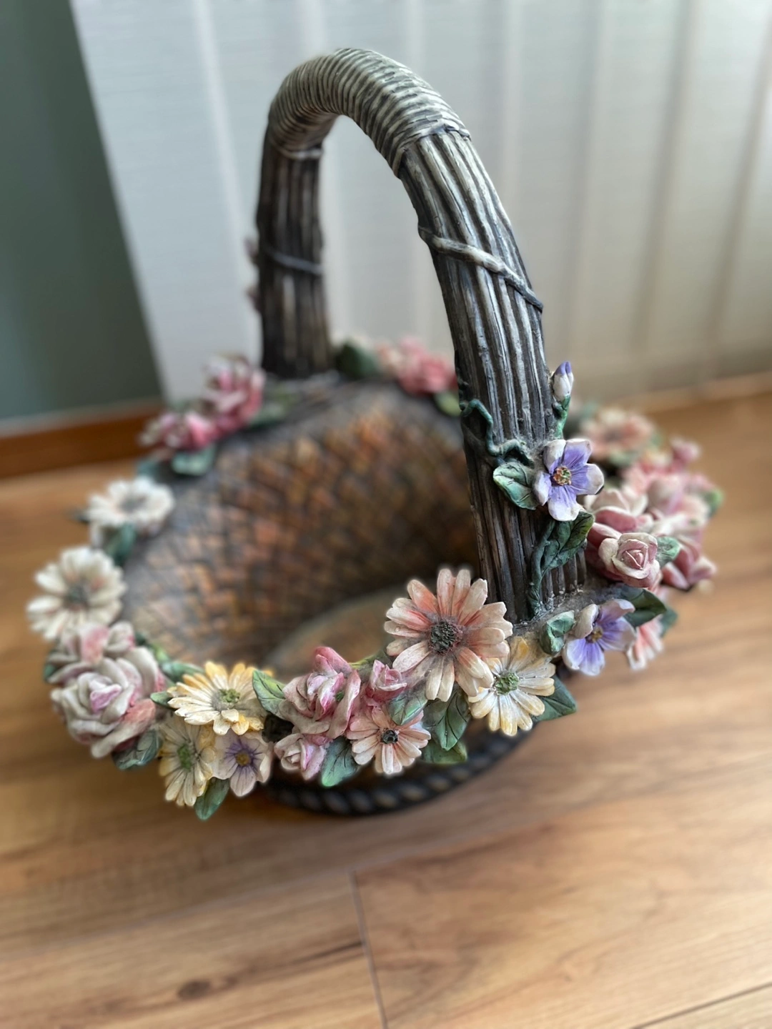 This is a lovely floral basket! It has a decorative handle and is surrounded by beautiful flowers. It would be a great addition to any home cash only please no e-transfers thank you