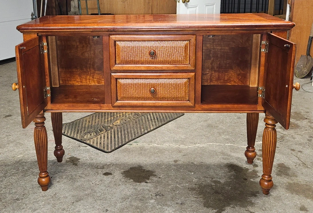 Here's a lovely wooden sideboard cabinet. It features two drawers and two doors, perfect for extra storage in your dining room or living room. It's in used condition with some wear and tear on the top, as shown in the photos.