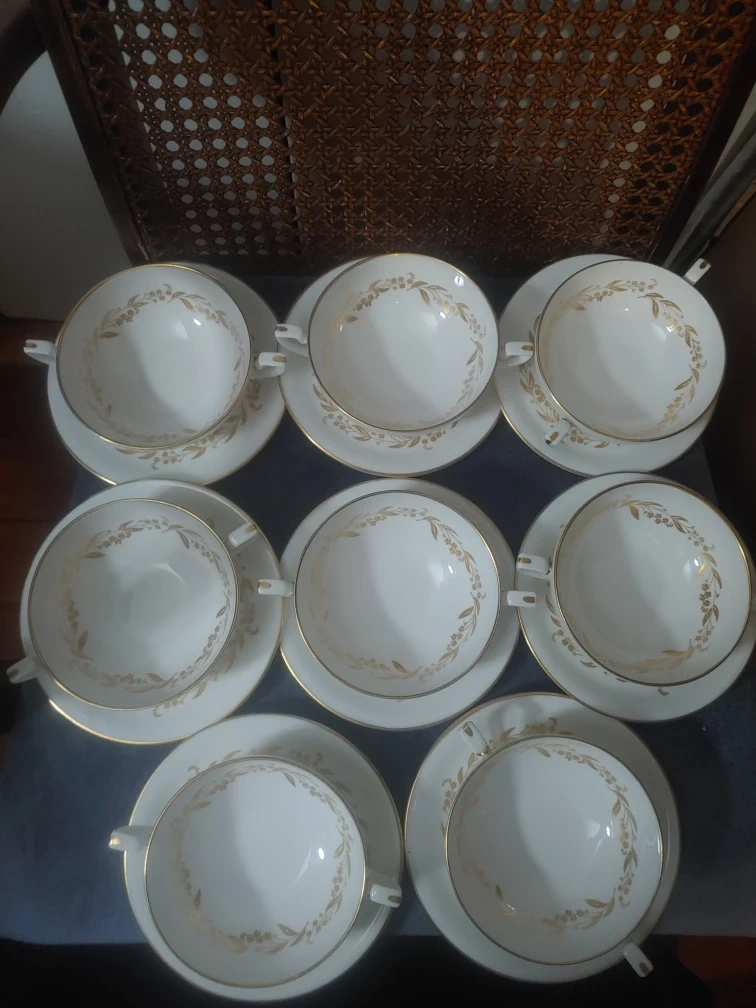 Selling a set of eight Royal Worcester Saguenay cream soup bowls with matching saucers. They feature a delicate gold floral design on a white background. These are in great condition and would add a touch of elegance to any table setting, $20 each set