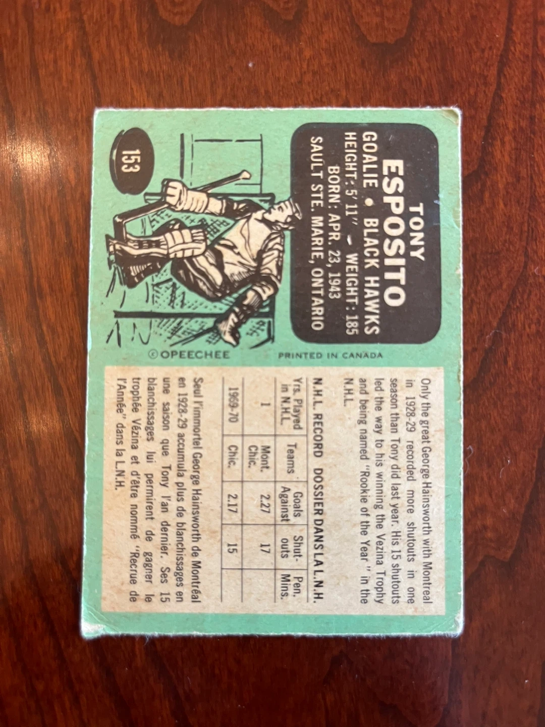 Buy & Sell1970 O-PEE-CHEE 153 TONY ESPOSITO1970 O-PEE-CHEE 153 TONY ESPOSITO$201970 O-PEE-CHEE 153 TONY ESPOSITO0 chats·0 favorites·2 viewsSELLERJimGlen Abbey221 reviewWHERE TO MEETFriars Ct