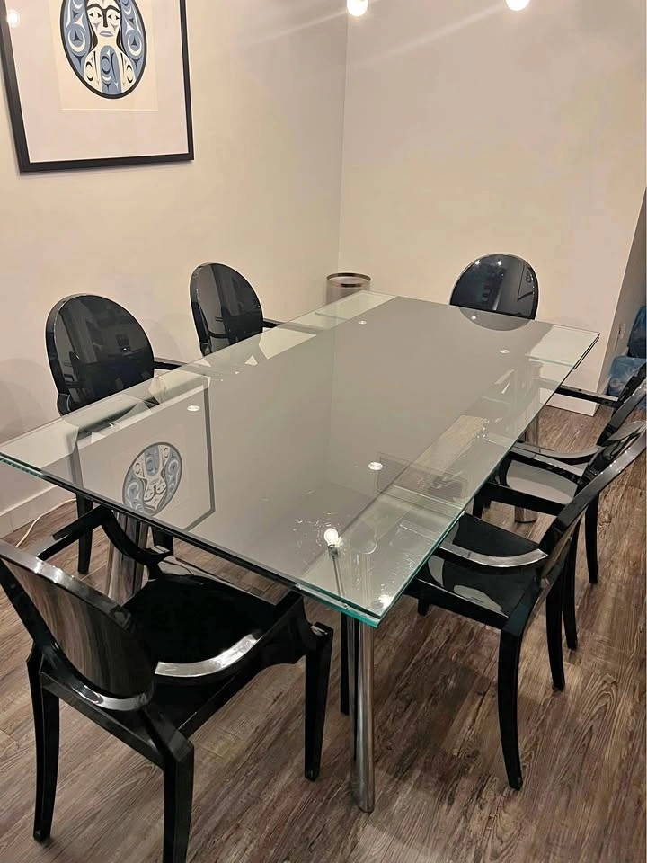 Glass top dining table and black acrylic chairs.