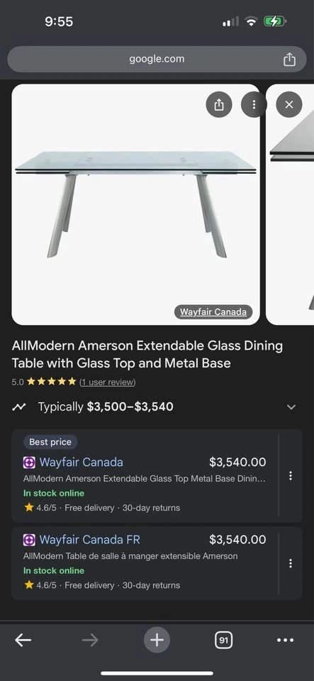 Brand: AllModern Amerson Extendable Glass Dining Table with Glass Top and Metal Base