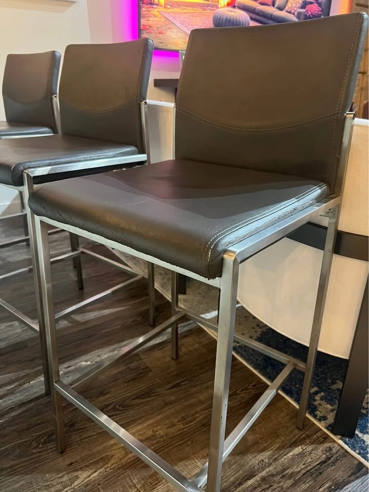 Three bar stools. Use and some wear and tear seen in the photos. Great for bars and high top tables.