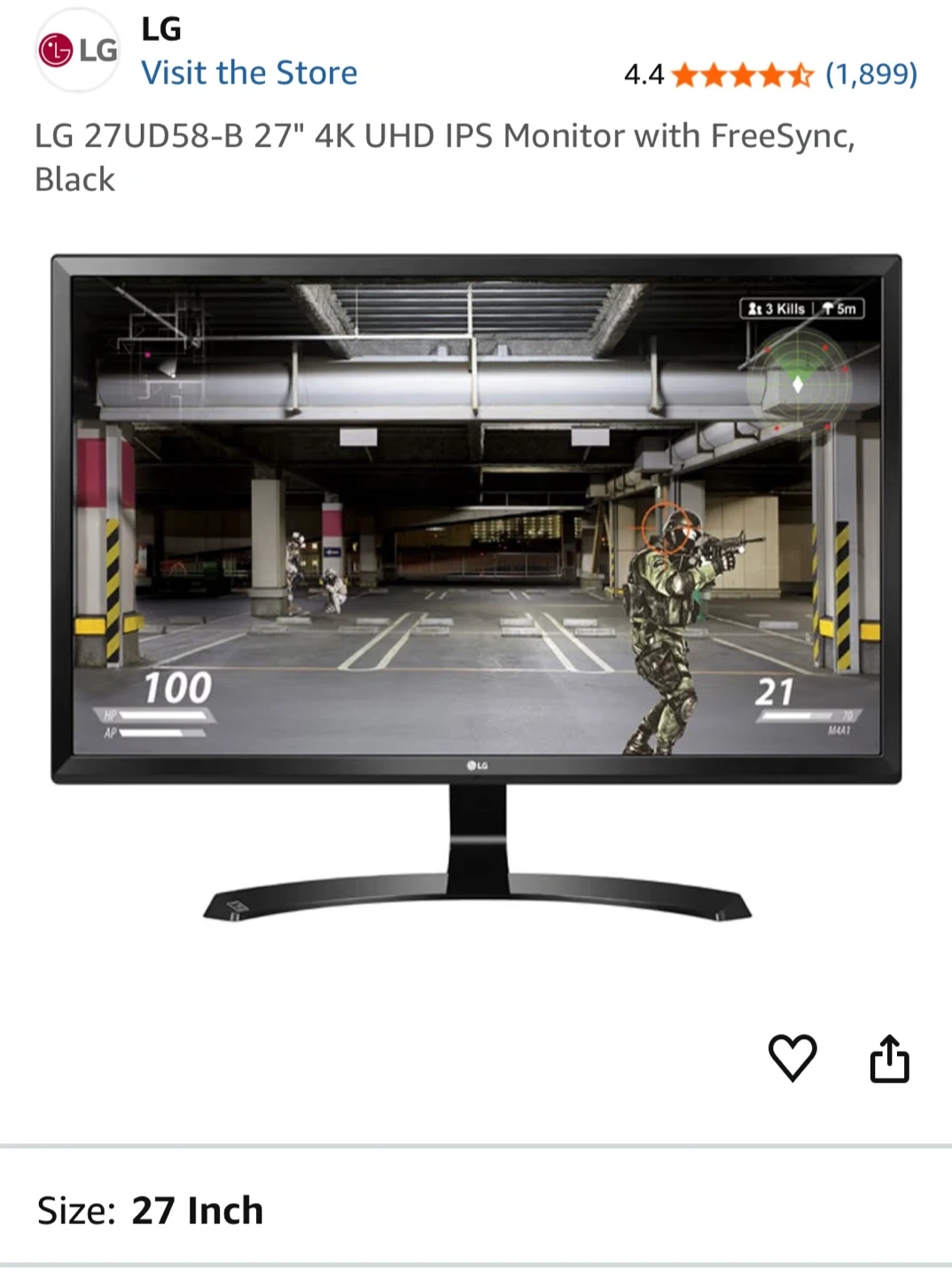 Selling an LG 27UD58-B 27-inch 4K UHD IPS monitor with FreeSync. It's in great condition and ready for a new home! The size is 27 inches. Also includes USB-C cable for connection to a computer