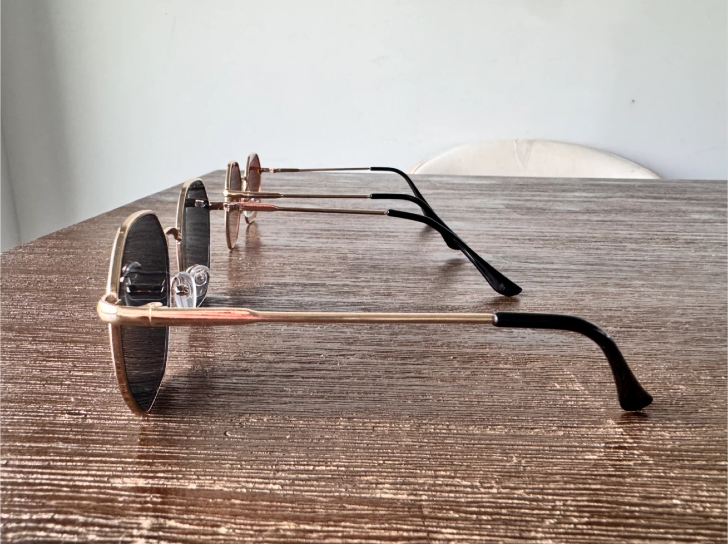 Selling two pairs of sunglasses! One pair has black lenses and the other pair has brown lenses. Both have a gold frame and are brand new never worn.