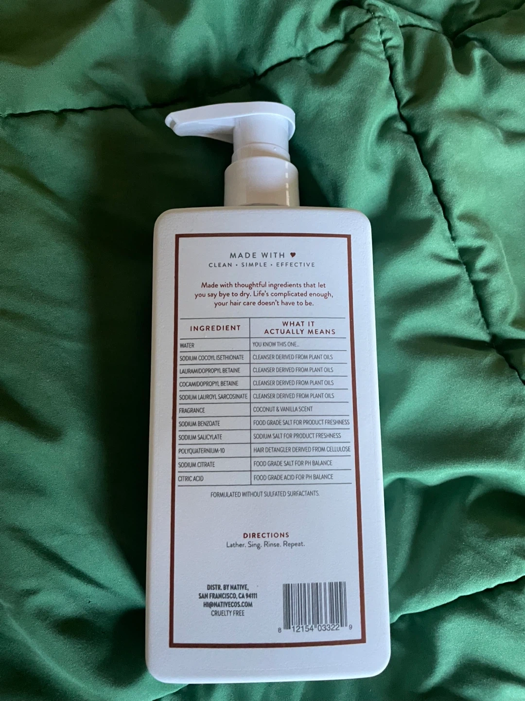 Selling a BRAND NEW, UNOPENED of Native Coconut & Vanilla Moisturizing Shampoo. It's a 16.5 fl oz (487 ml) bottle of hair care goodness! Made with clean ingredients, it's silicone, sulfate, and paraben free. Perfect for adding moisture to your hair. Bought for $8.