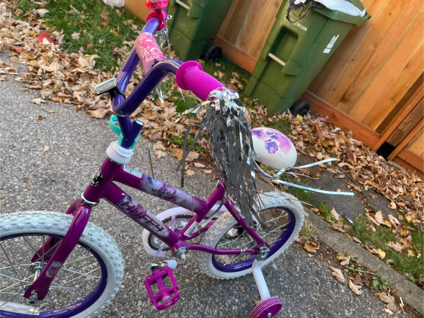 Selling a Huffy Sea Star girls' bike in purple and white! It's in great condition and ready for a new rider. Only used 2-3 times Perfect for learning to ride with its cute design and sturdy build!