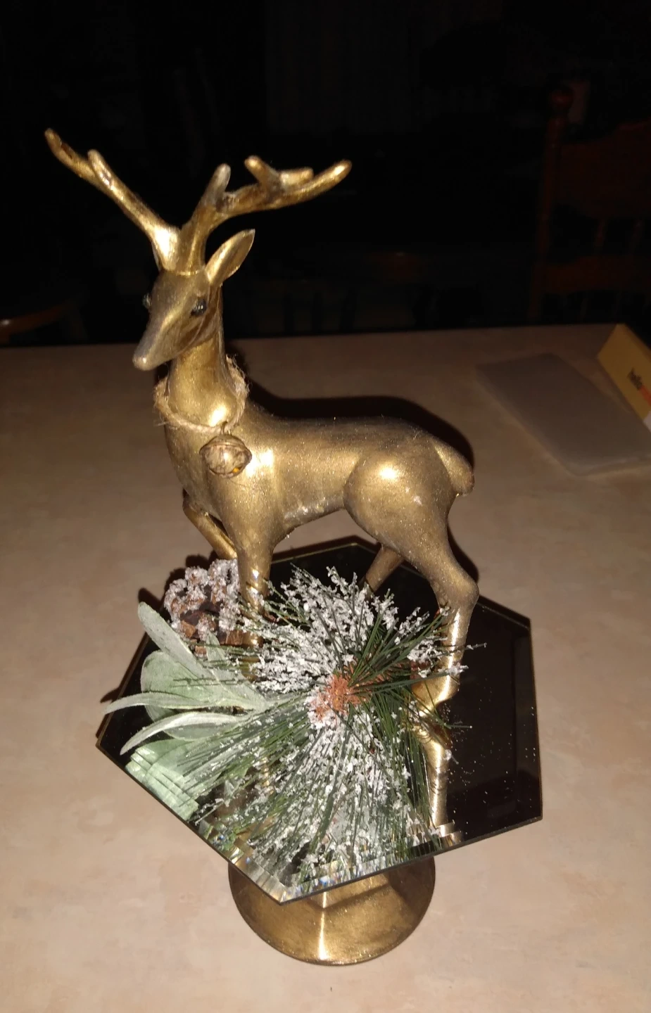 A lovely deer figurine decoration for your home! It features a golden deer standing on a mirrored base with some festive greenery. It's in great condition and would make a wonderful addition to your holiday decor or as a year-round accent piece. Great gift idea