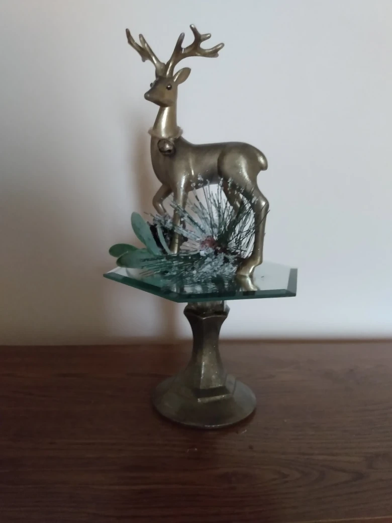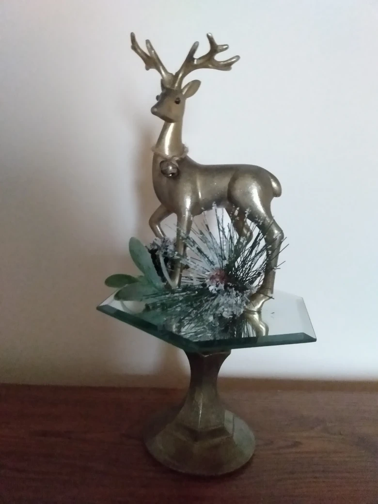 A lovely deer figurine decoration for your home! It features a golden deer standing on a mirrored base with some festive greenery. It's in great condition and would make a wonderful addition to your holiday decor or as a year-round accent piece. Great gift idea