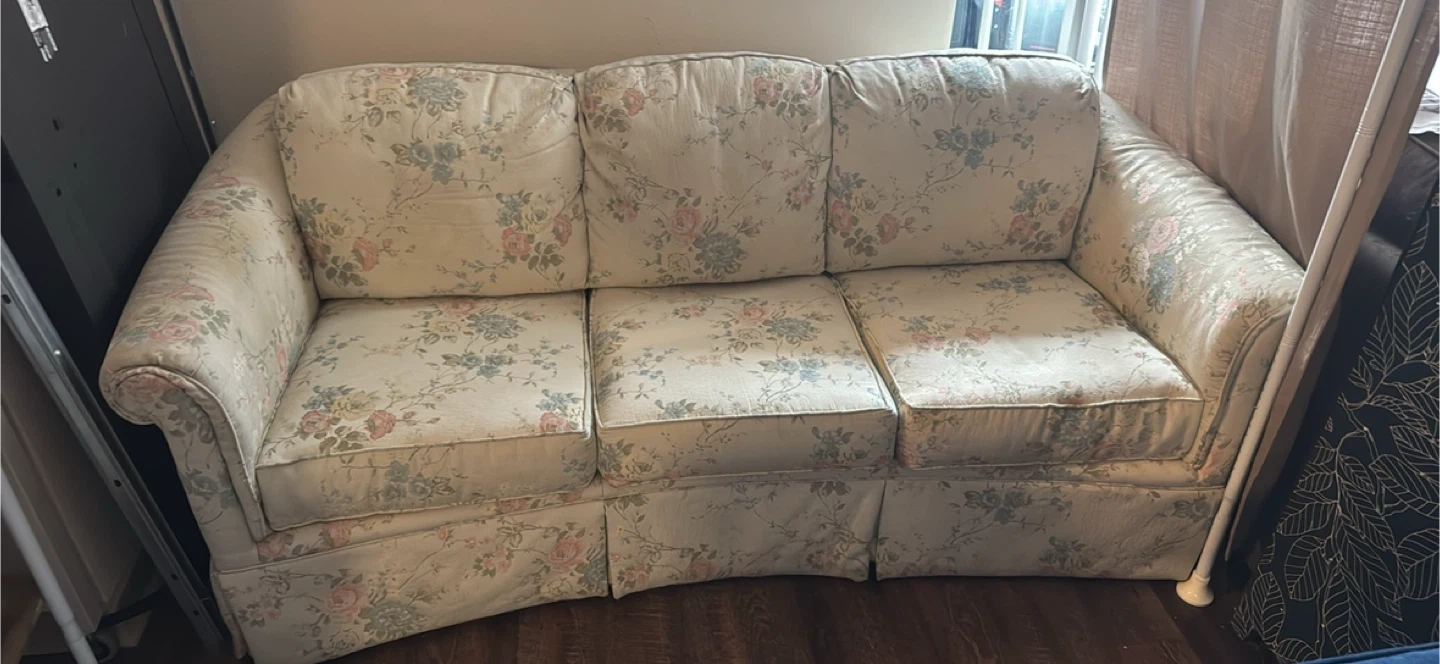 Selling a comfortable sofa with a floral pattern. It's a charming piece that could add a cozy touch to any living space. It shows some signs of use but is still in good condition for its age