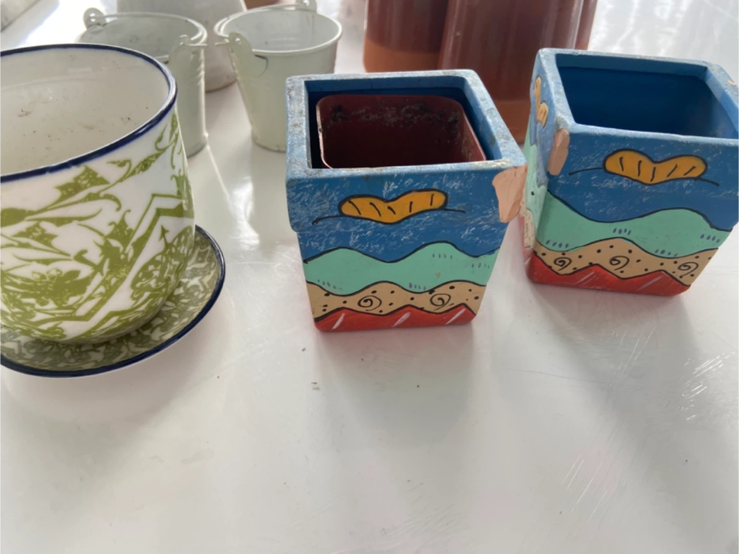 Selling a variety of decorative plant pots. There are several different styles and sizes available.