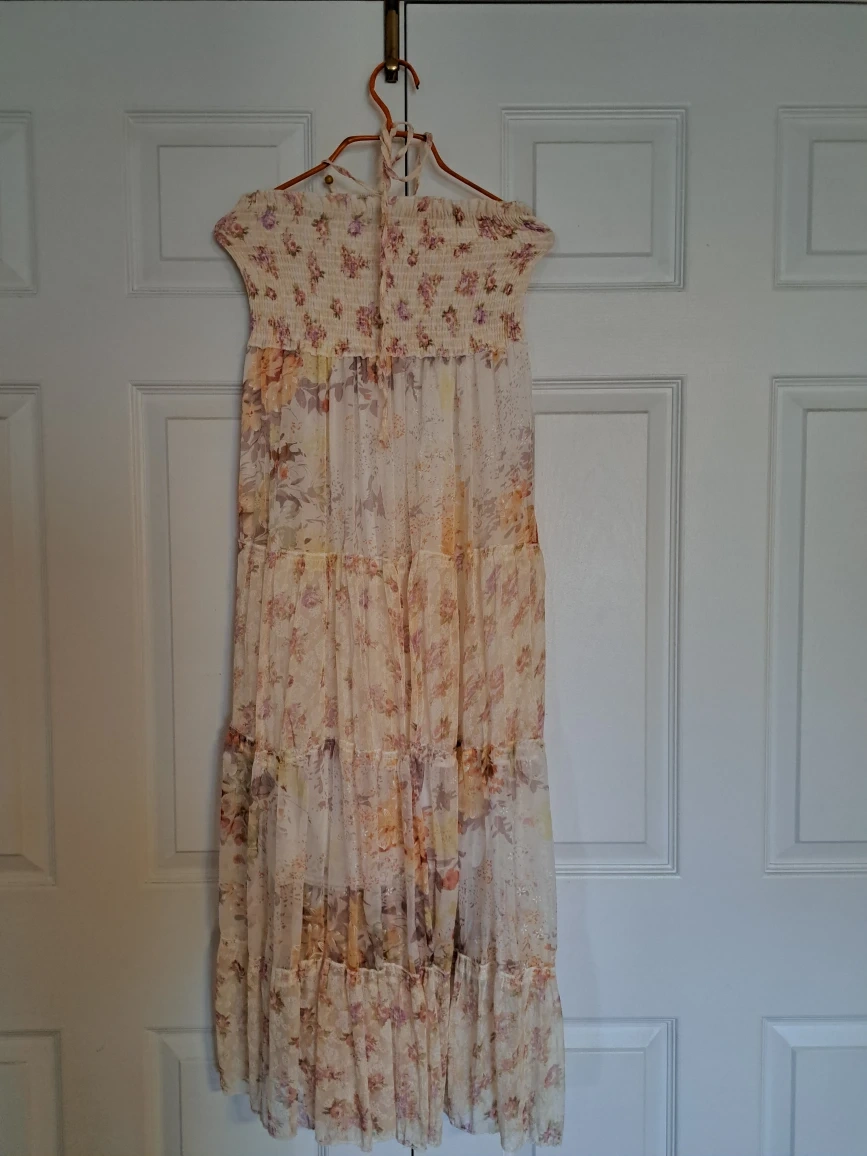 Selling a lovely floral maxi dress in a size small. It's in great condition and has a beautiful, flowy design. The dress starts from the chest to the mid legs, showung your sexy shoulders, tying at the back of your neck. Perfect for summer days or evenings out!