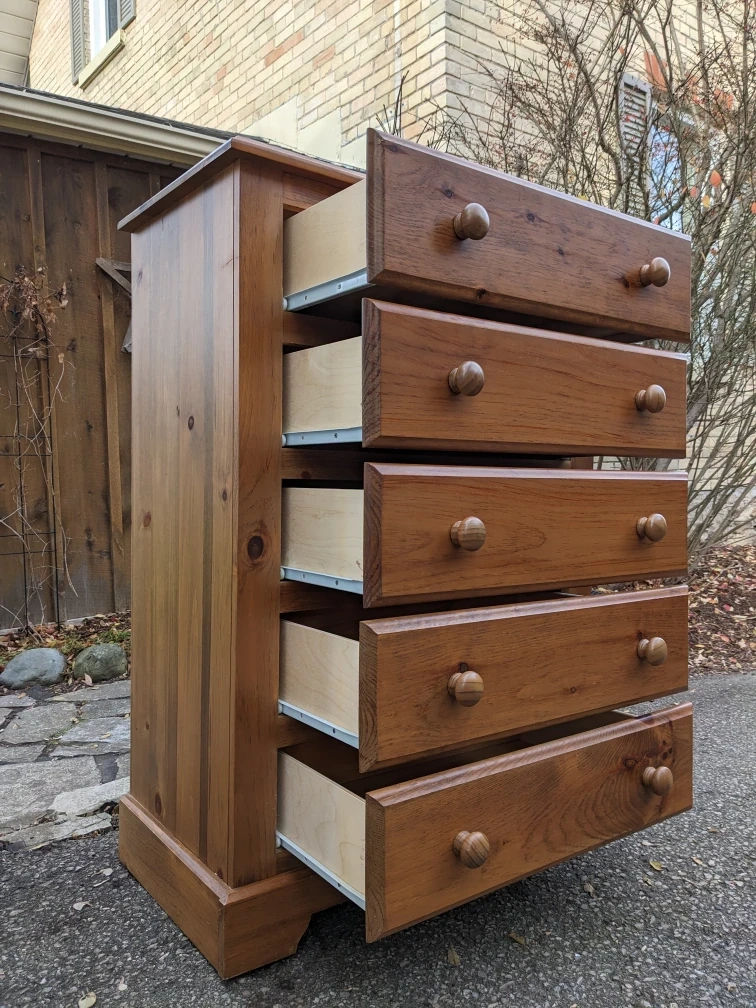This 5 drawer tallboy dresser in solid pine features spacious drawers that all open and close perfectly on their metal slides with security stop system. The drawer pulls are made of durable solid pine.