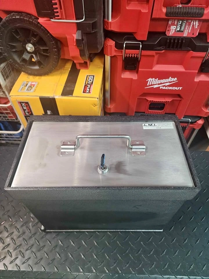Solid metal storage box with a high-security ABLOY lock. Perfect for tools, cash, valuables, or job-site use.