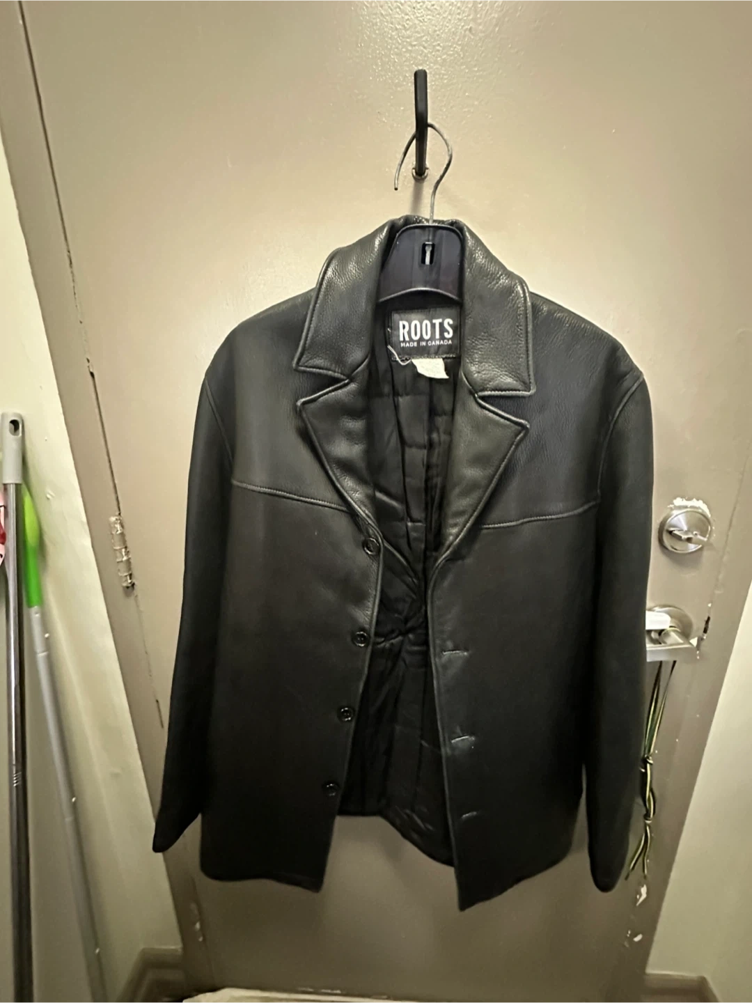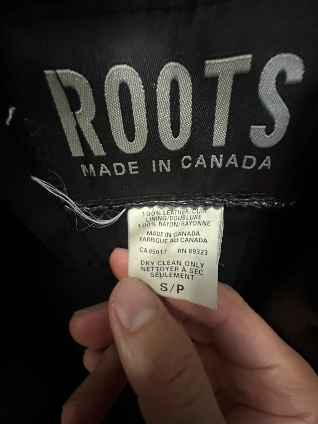 Selling a Roots black leather jacket in size S/P. It's made in Canada with 100% leather for the outer layer and 100% rayon lining. It's in great condition!