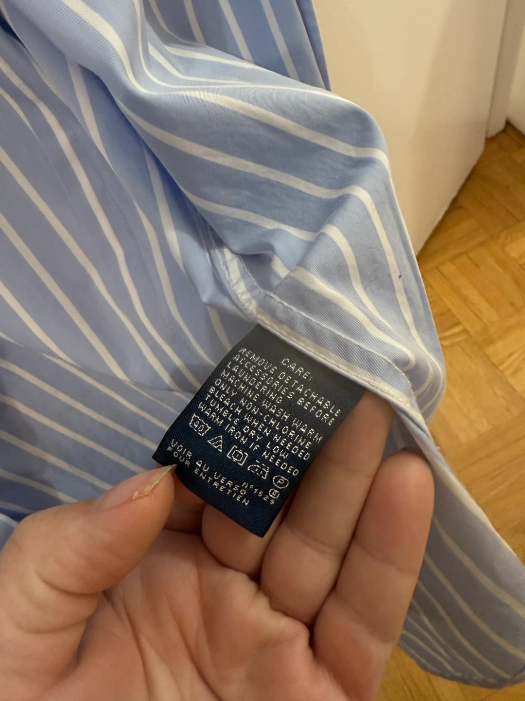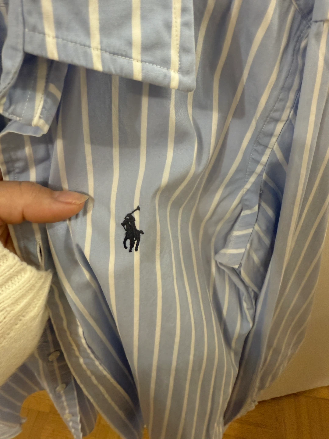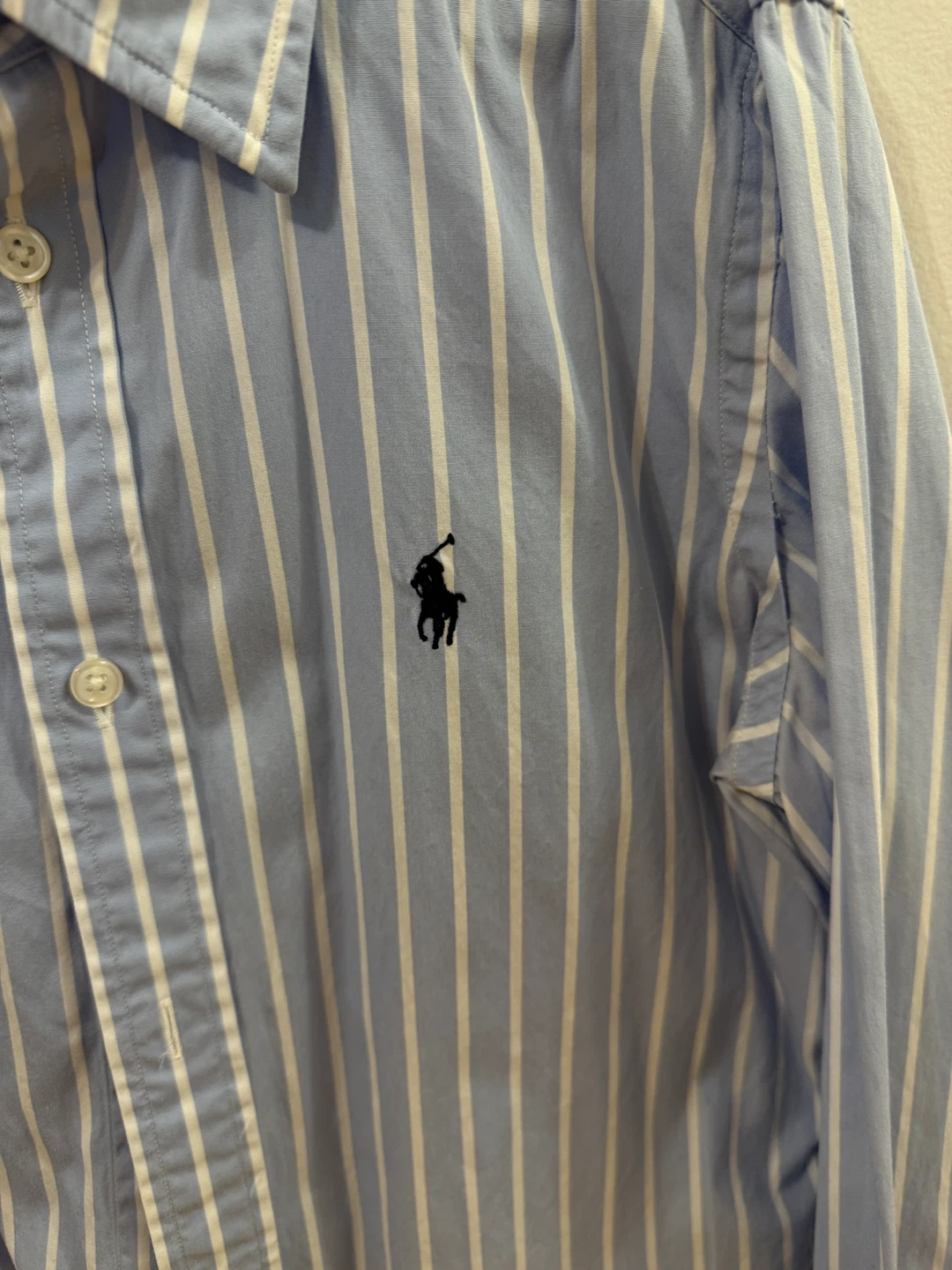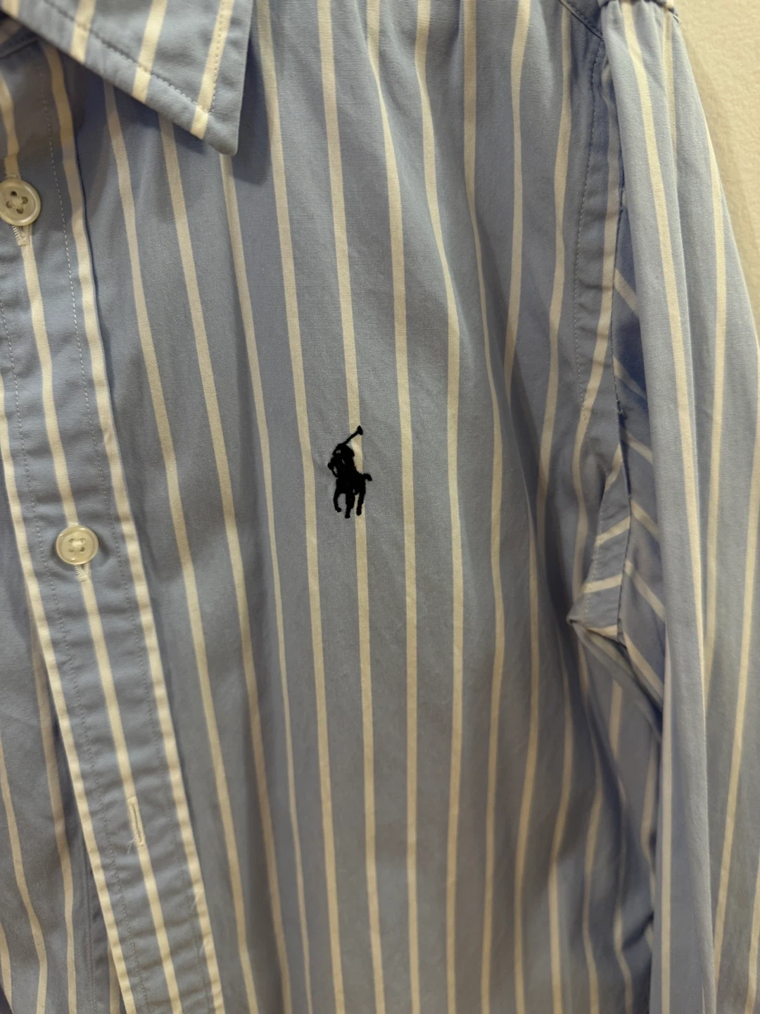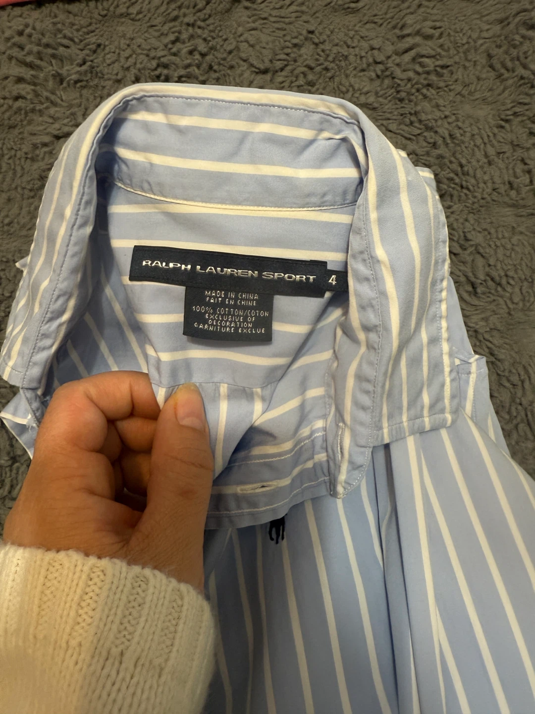 Here's a Ralph Lauren Sport shirt in a light blue and white striped pattern. It's a size 4 and made of 100% cotton. Would look great dressed up or down!