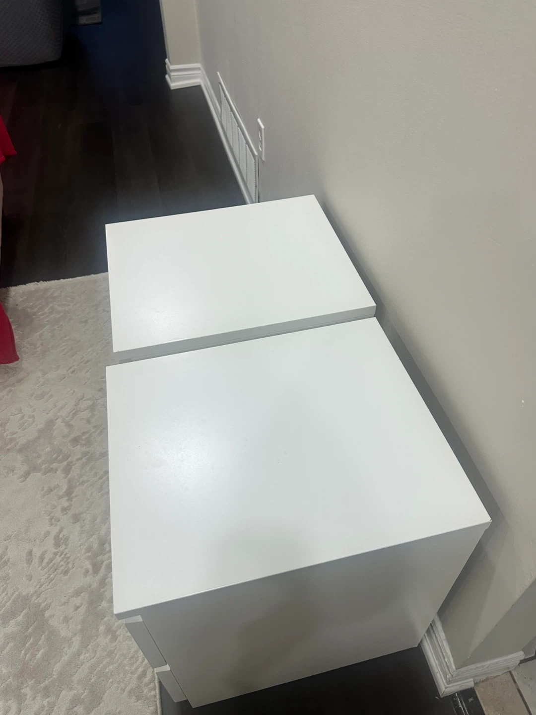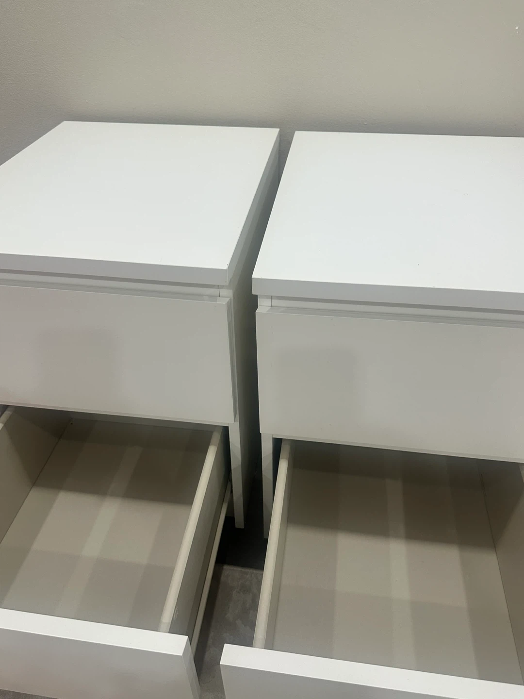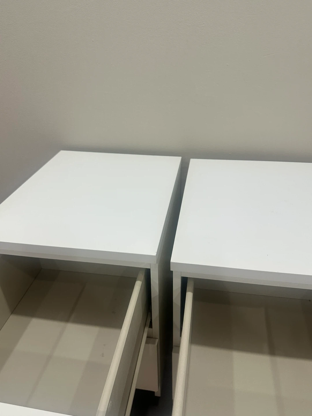Selling a pair of simple white bedside tables. They're in good condition and ready for a new home! Perfect for adding some storage and a clean look to your bedroom. Selling as a set.